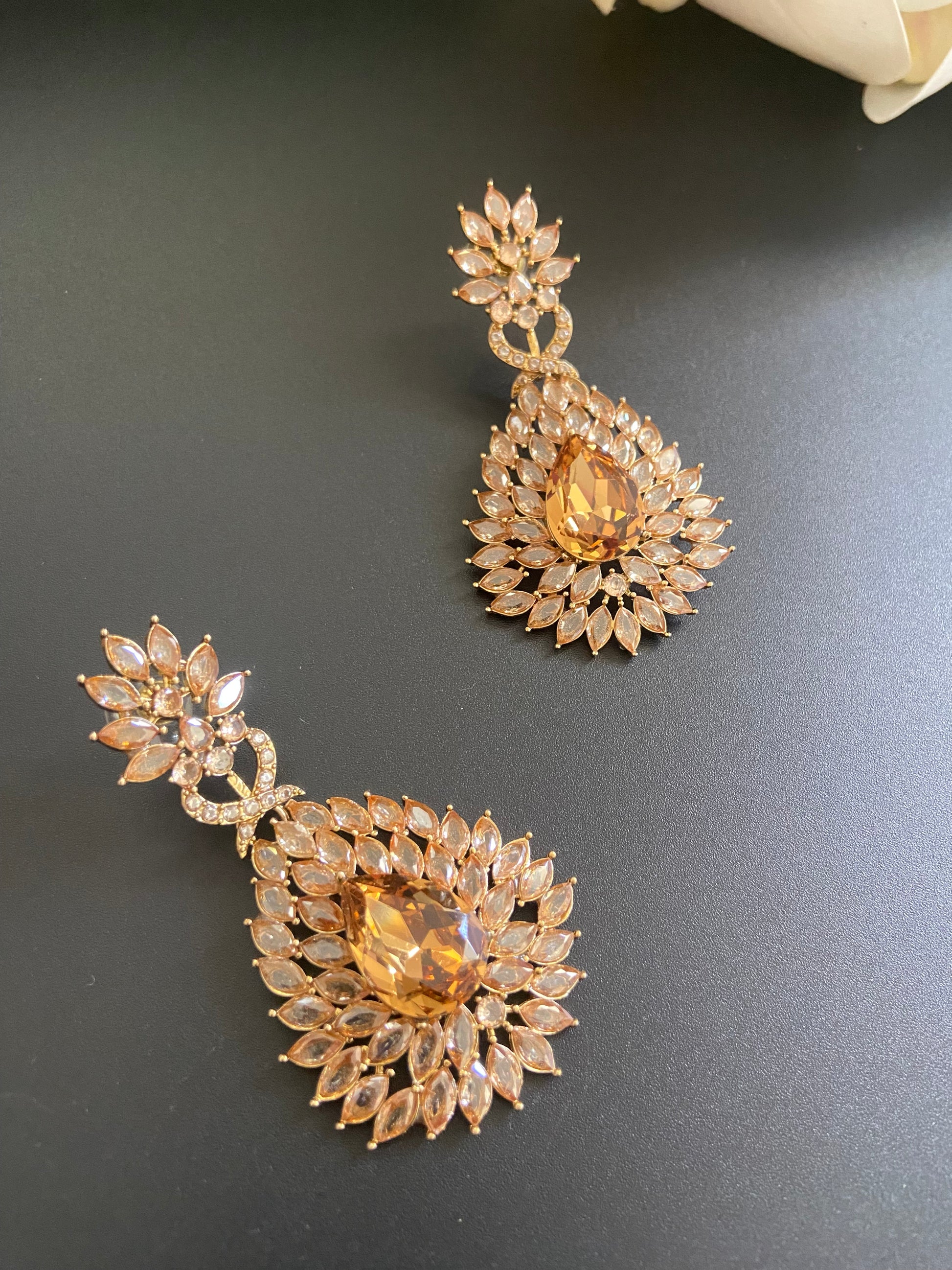 Exude opulence with these radiant teardrop earrings. Embellished with a mesmerising amber-toned central stone, surrounded by a delicate halo of sparkling crystals, these earrings bring the perfect balance of glamour and allure. The dual-layered design combines floral elegance with bold, glamorous flair, making these earrings the perfect statement piece for formal events or a night out.