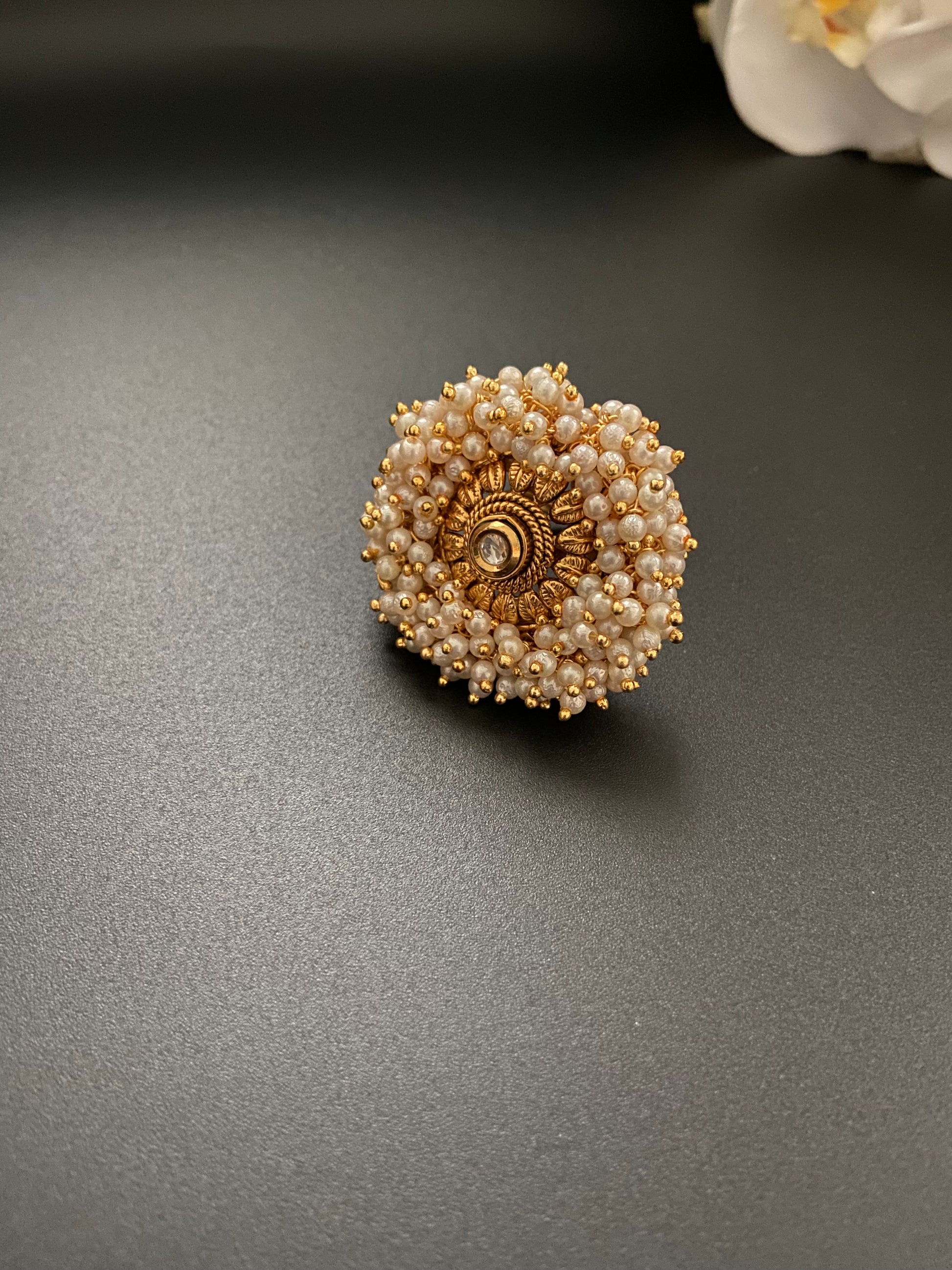 A refined amalgamation of subtle and sparkle, this ring is all about making a statement. Handcrafted with utmost love and thought, it is adorned with Filigree detailing with Kundan in center. A fine pick to amp up your look.