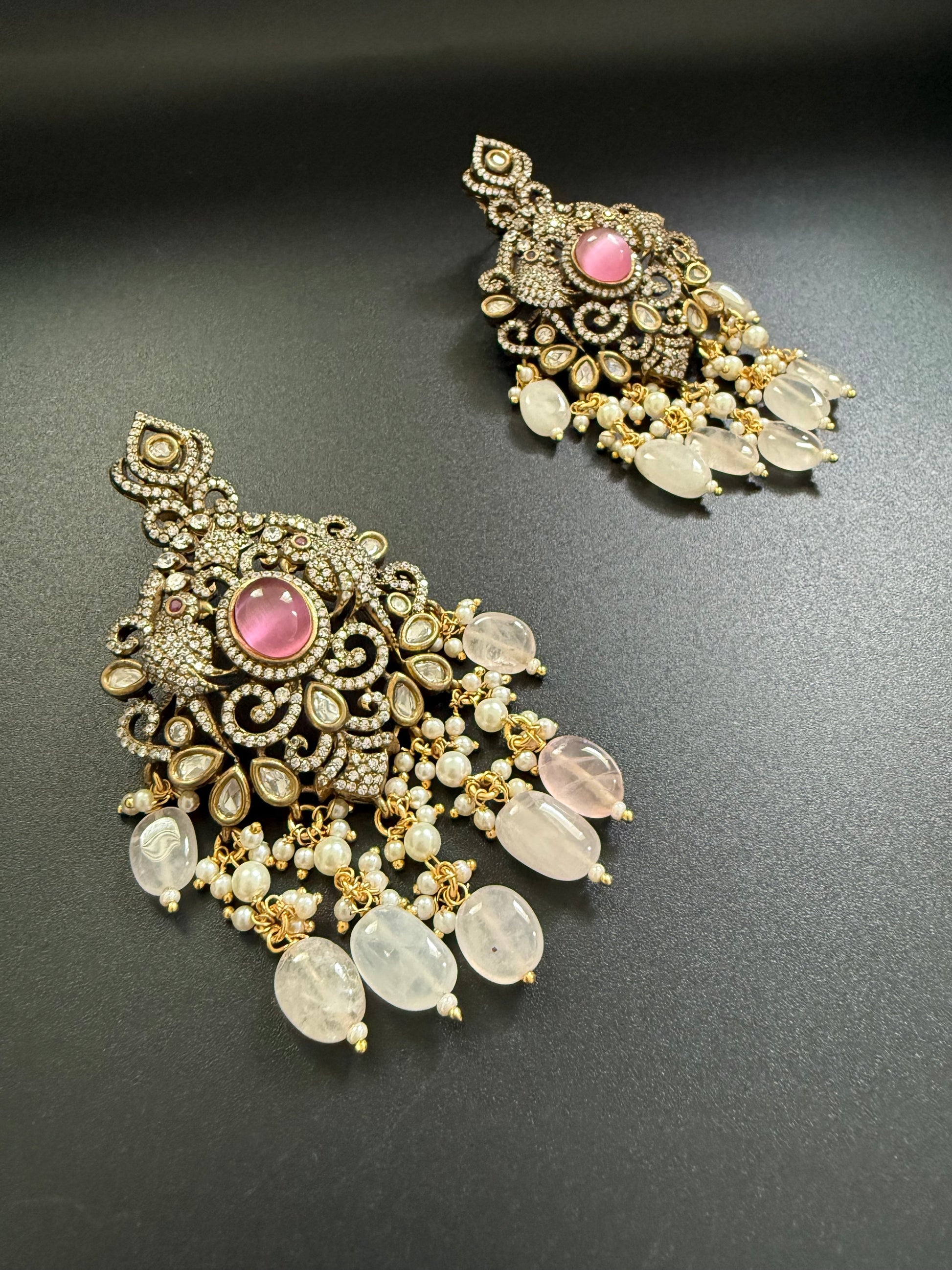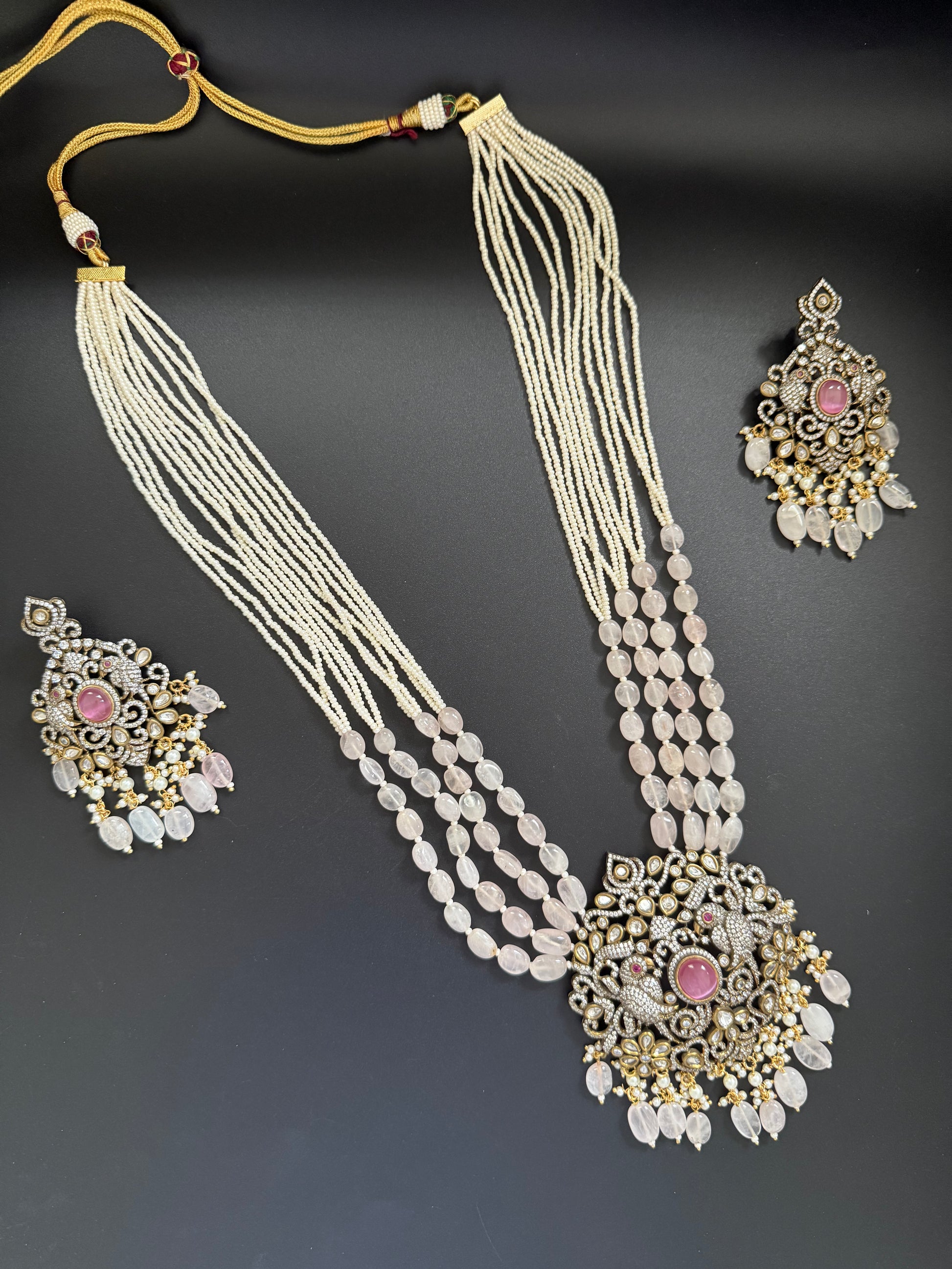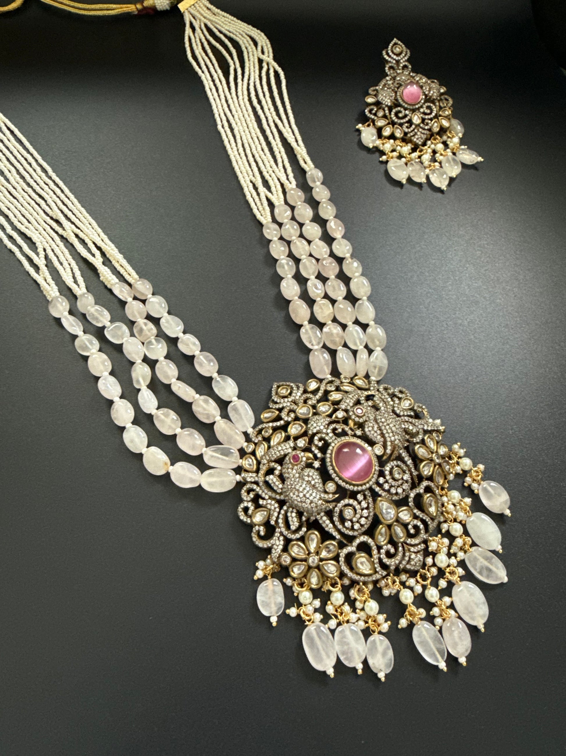 A subtle blend of detail and delicacy, this layered necklace set features baby pink stones, kundan accents, and a hint of antique Victorian finish. The necklace is strung with soft pink beads and tiny pearl-like strands, anchored by a statement pendant with intricate metalwork and a blush stone at the centre. Comes with matching earrings.