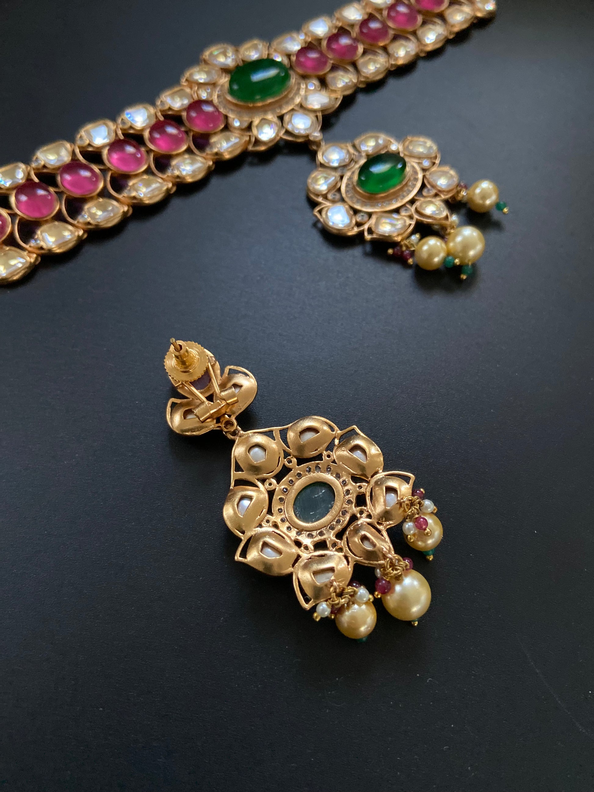Accentuate your look with this timeless choker set that is all about splendid design and playful stone decoration. Featuring a vibrant floral design, it comes in a Kundan setting. With the classic ruby green combination, it is traditional, regal and definitely a wardrobe must have.