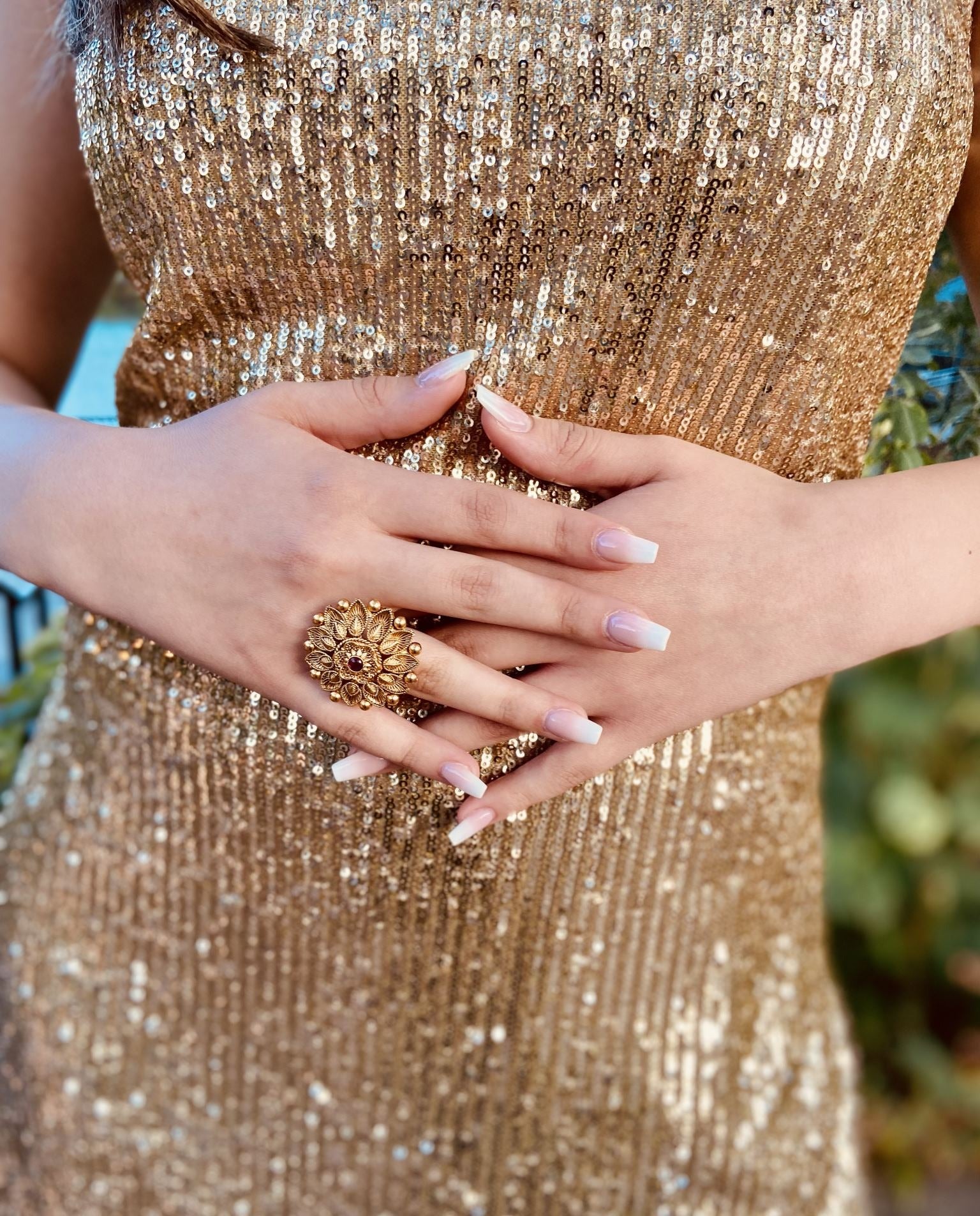 A lovely symphony of traditional designs and rich details, this ring is effortlessly opulent. A classic floral design, it is accentuated with a ruby colored centre stone and is a striking pick for all your celebratory occasions.