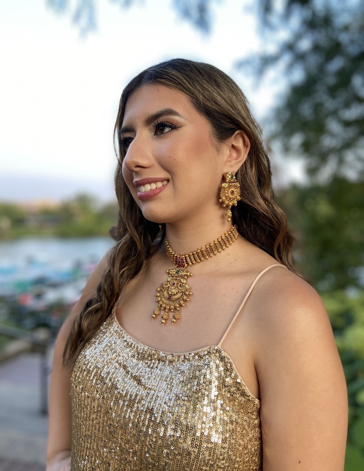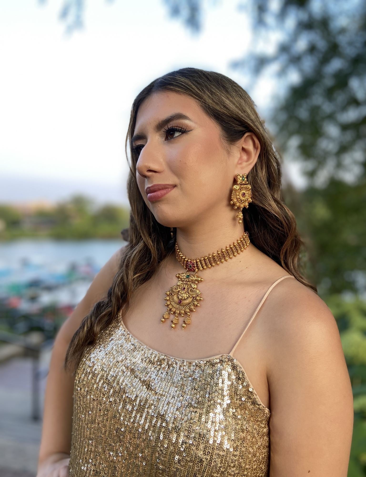 Perfectly proportioned with certain lightness and never ending grandeur, this temple choker set comes with an antique gold finish. With intermingling tints of ruby, green and gold, it has been effectively designed for that classic chic look. An ideal pick for occasions ranging from weddings to festive parties.