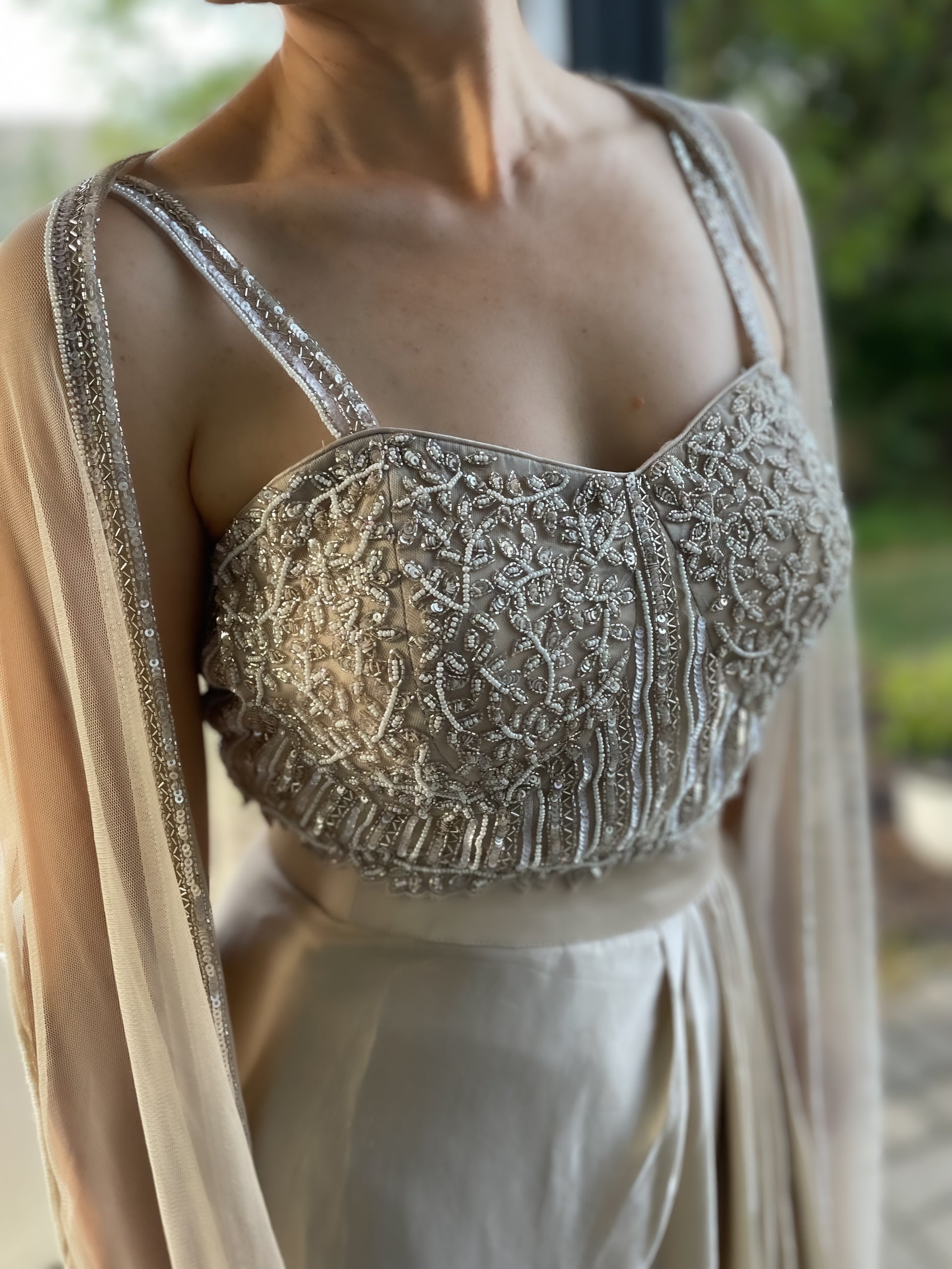 Capture the essence of elegance with our enchanting ensemble, perfect for weddings and gala events. It features a delicate net cape, a luxurious silk top, and a satin draped skirt adorned with beads, sequins, cutdana, and intricate hangings.
