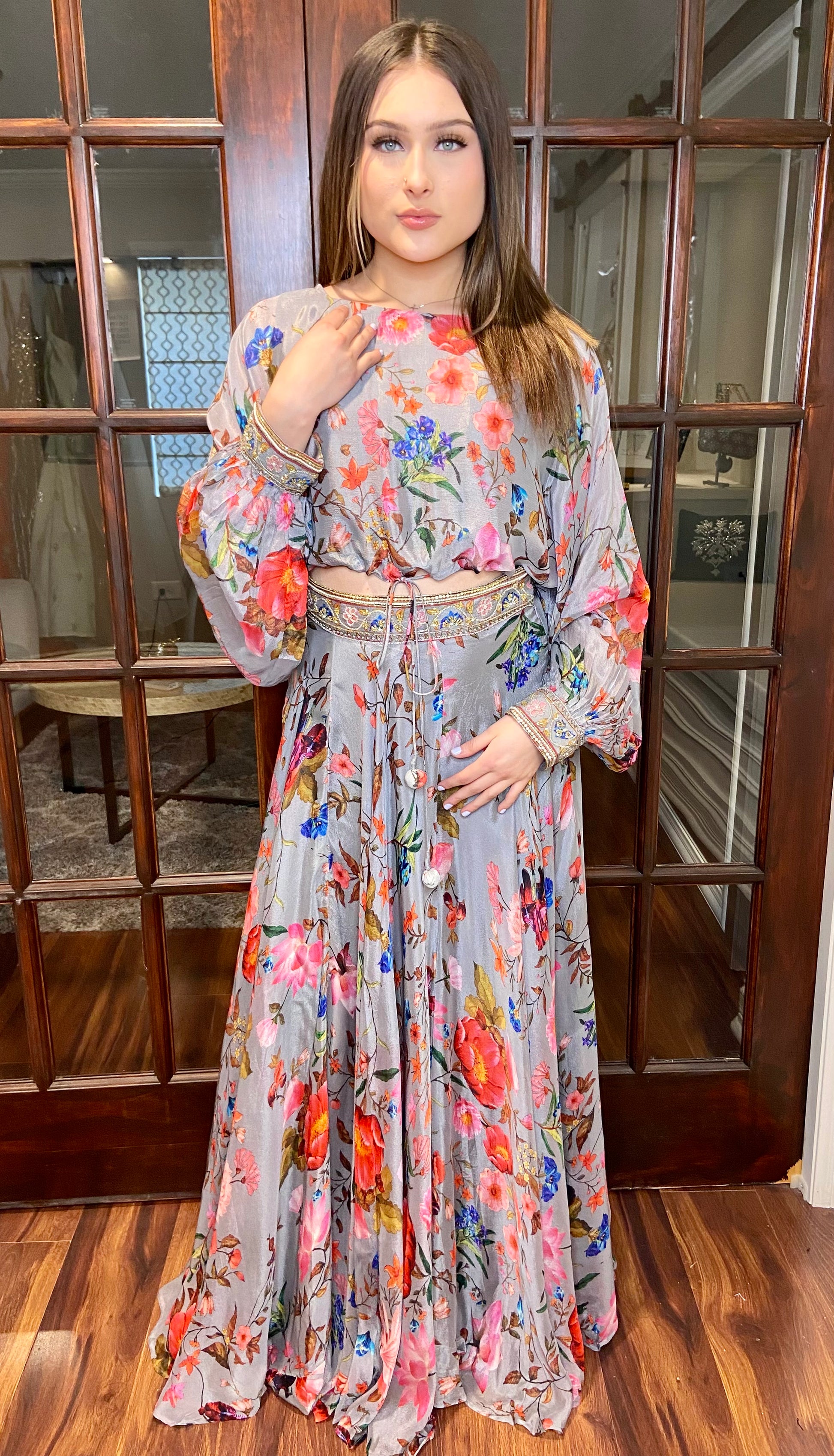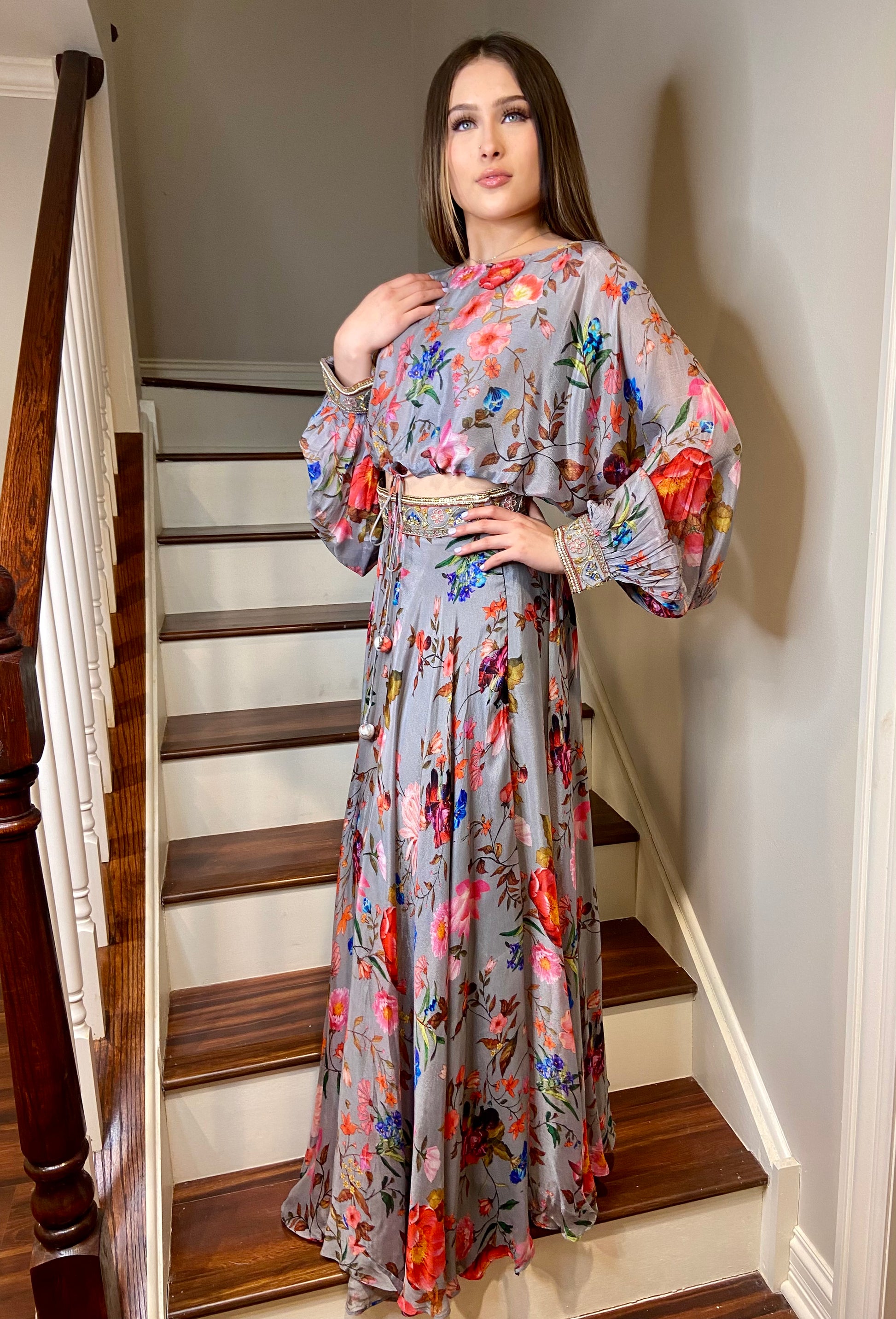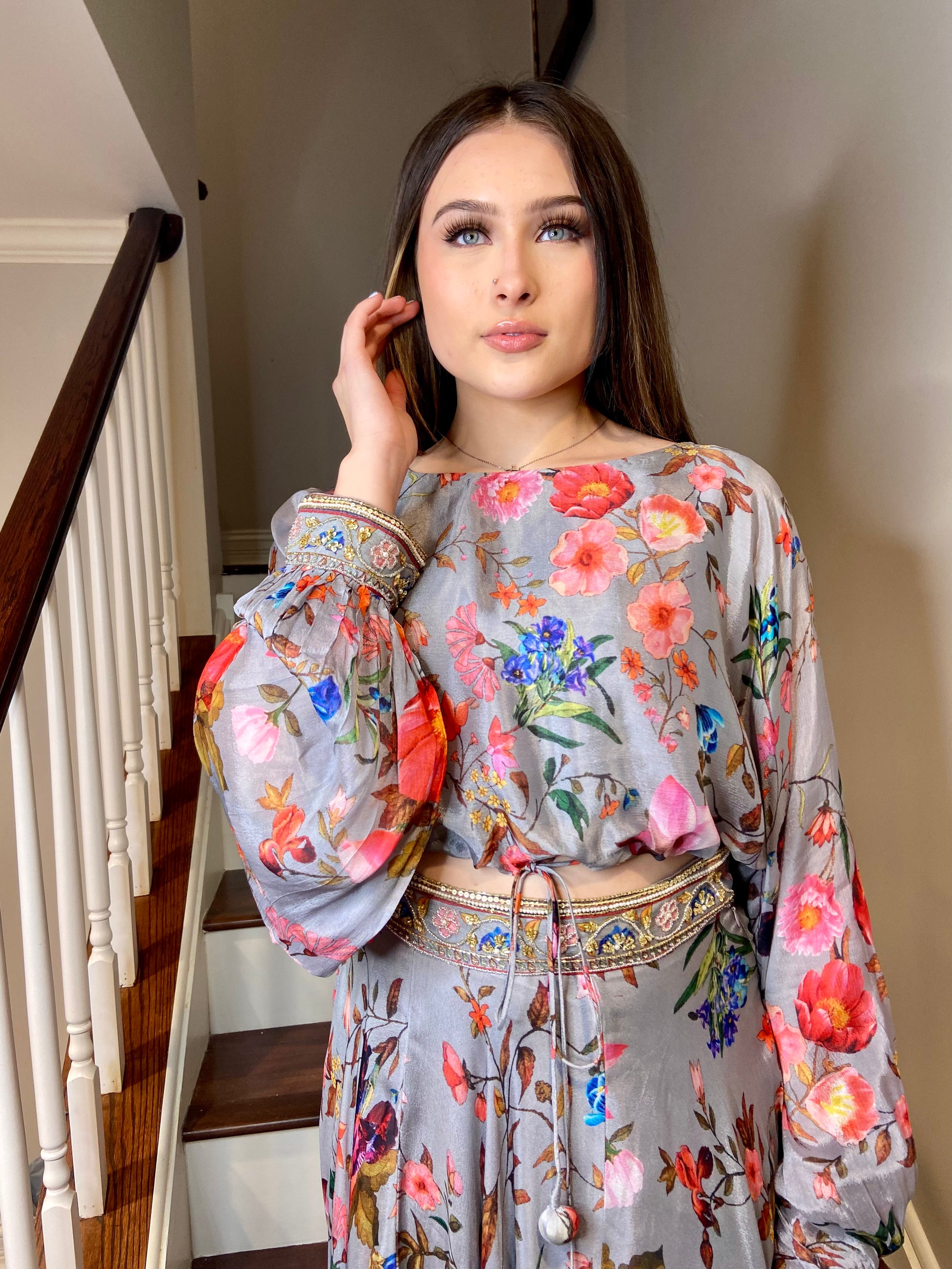 With a cheerful floral print, this beautiful ensemble features a crop top and skirt The embellished belt and cuffs add a pinch of chic to it. It is a versatile fit that compliments all your fashion moods