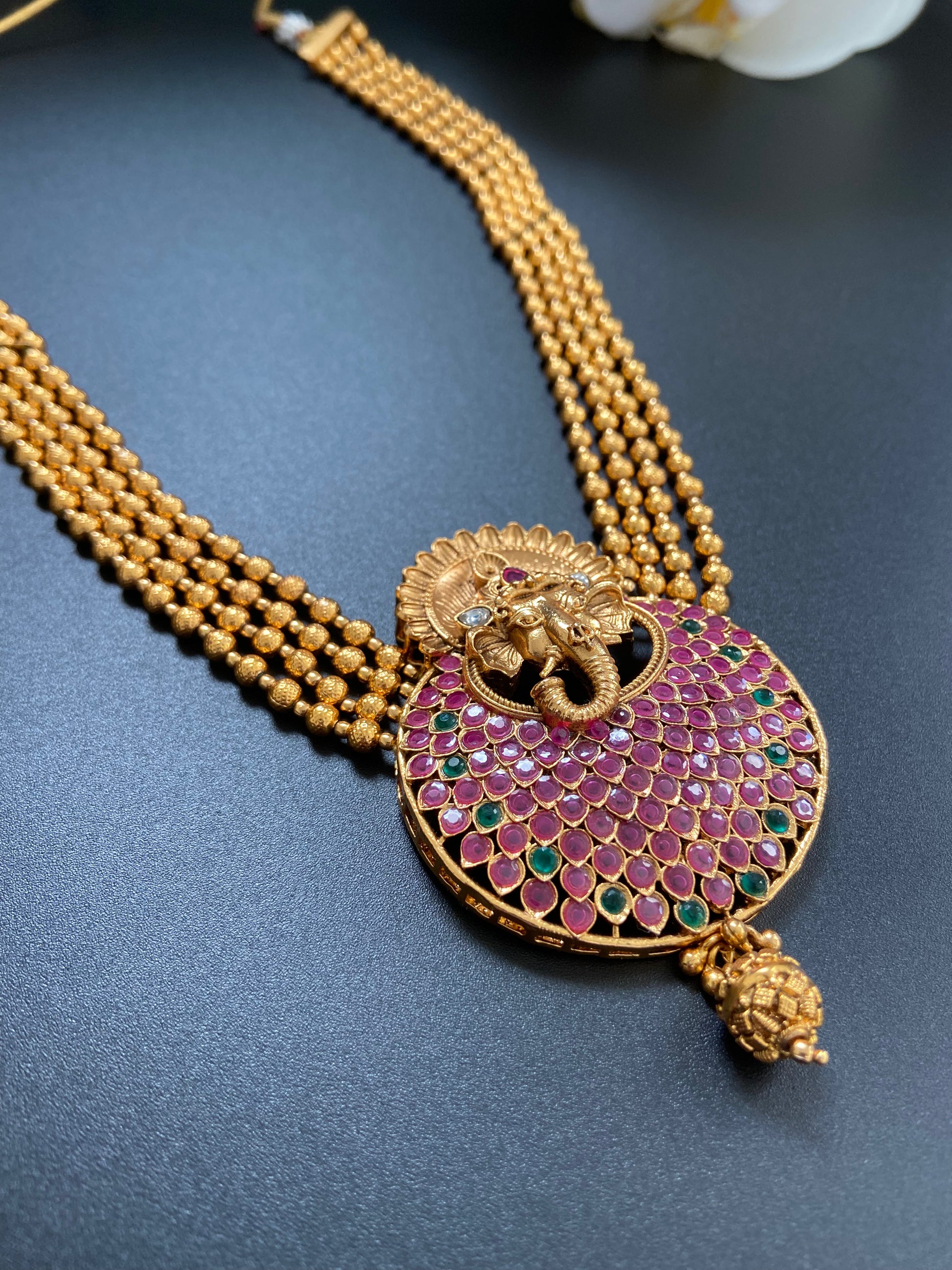 A vision of femininity and opulence, this pendant set is a wardrobe essential. Featuring a unique Ganesha motif in the center, it is intricate and detailed. Shades of ruby and green add a certain charm to the set. A great pick for occasions ranging from festive parties to wedding functions.