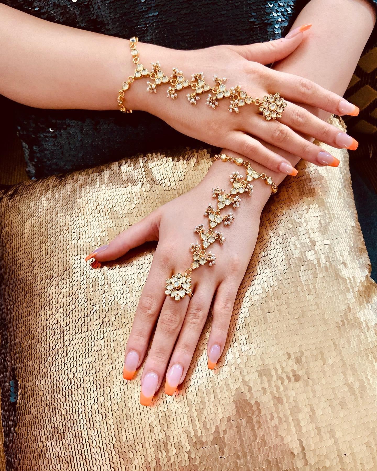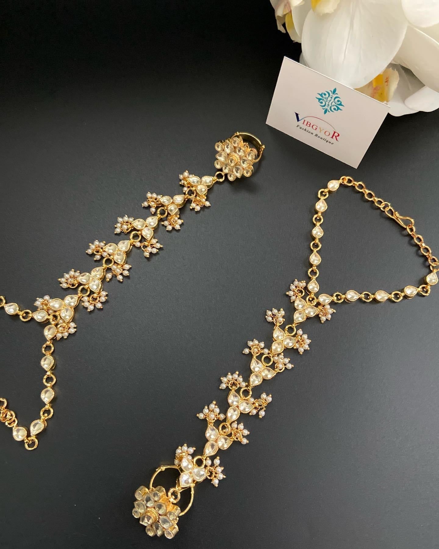 Designed for the discerning bride who demands nothing less than perfection, this Haath Phool is a standout accessory that will leave a lasting impression. Set in Kundan and adorned with baby beads, it is effortlessly beautiful. Its timeless elegance and flawless craftsmanship make it the perfect choice for wedding ceremonies, adding a touch of glamour and sophistication to any bridal ensemble.
