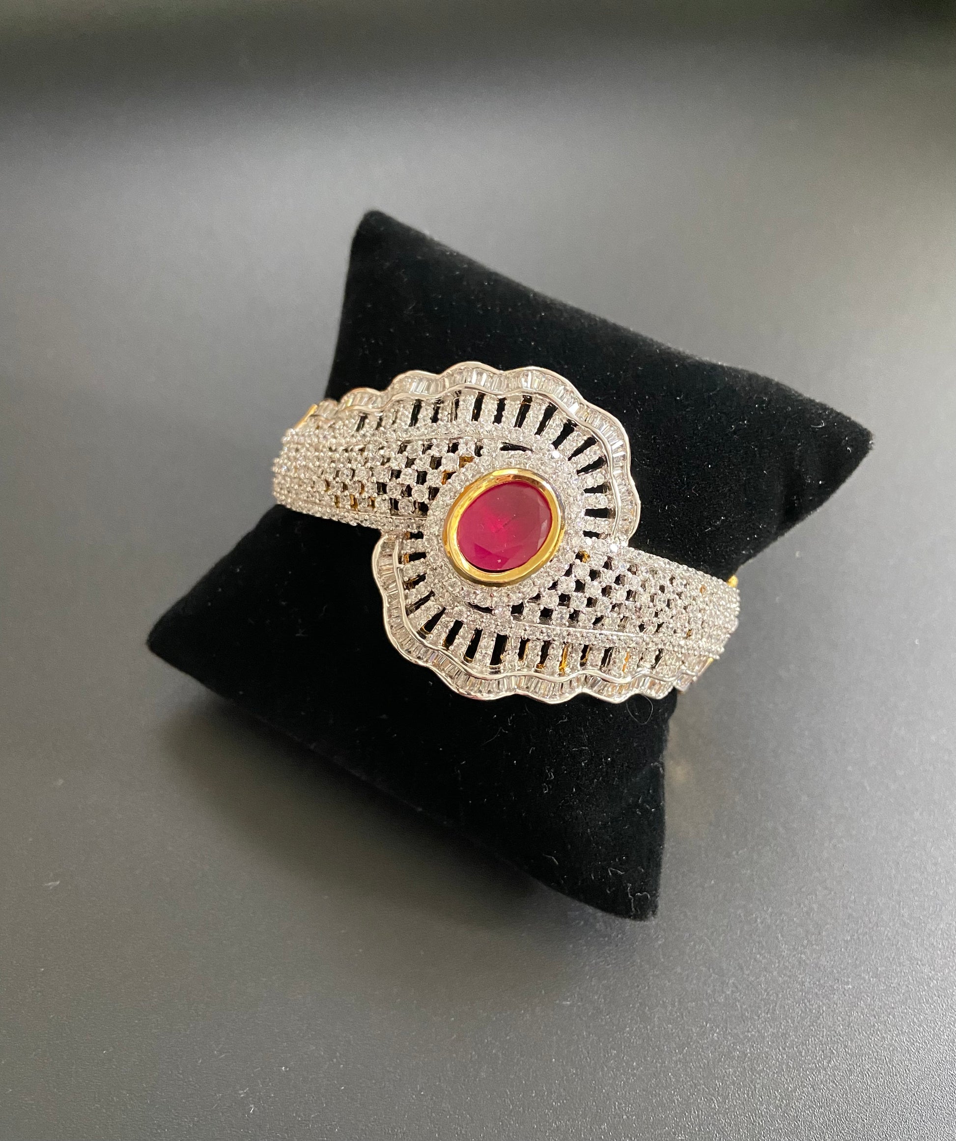 Embellished with dazzling crystals and stones, this Kada is designed to lift your look and make you feel like a diva. What makes this Kada truly special is the five different changeable stones that come with it, each in a different color. This allows you to switch up your look and add a touch of variety to your style, making it a versatile accessory that can be worn with a wide range of outfits. Its sleek and stylish design makes it the perfect accessory for any occasion, whether you're attending a wedding or going out for fancy dinner.
