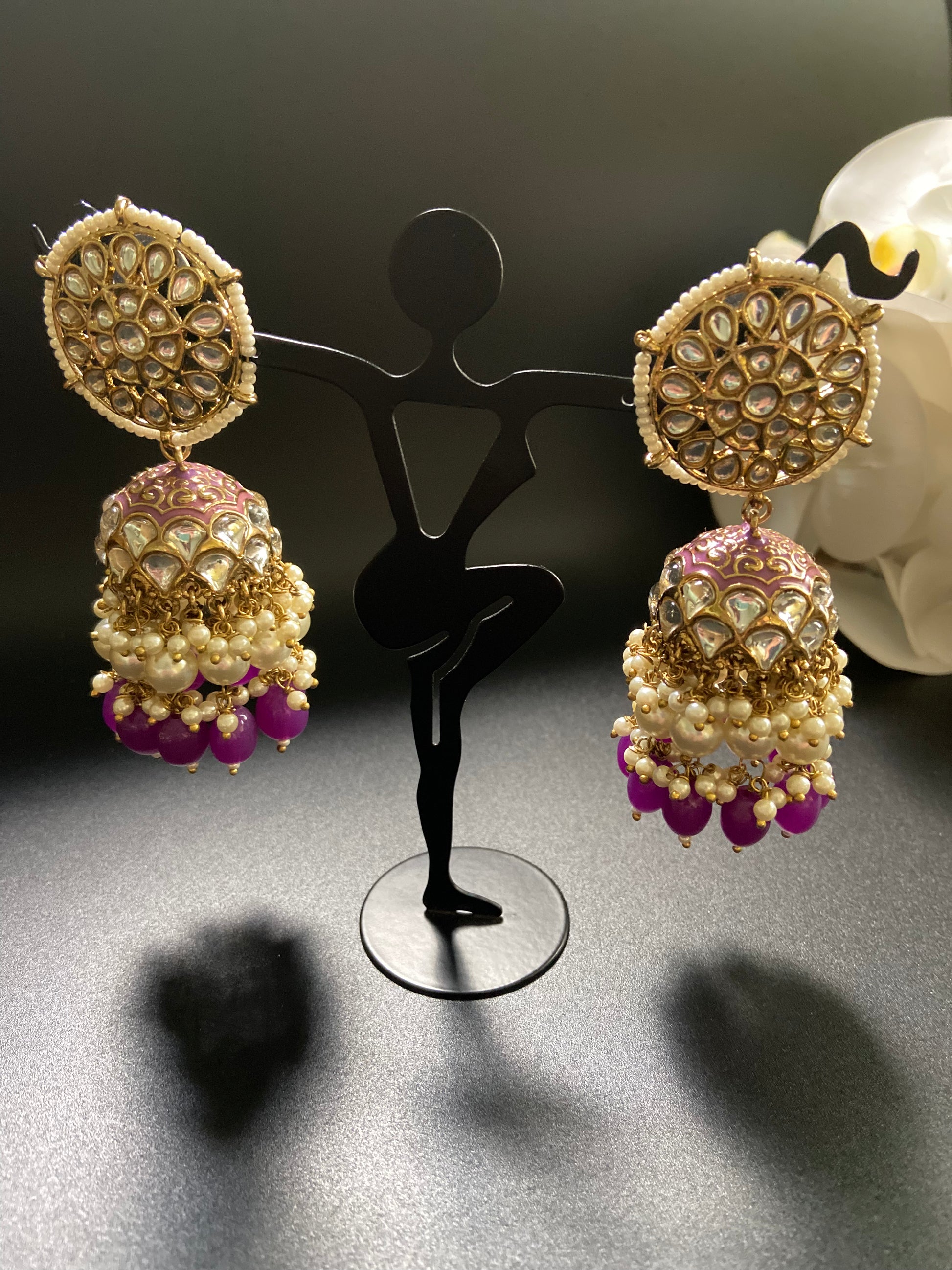 These Jhumkas feature intricate design on the dome and multi-layered cluster beads embellishments and monochrome beads. Further accented with a lotus design on ear to increase the oomph!