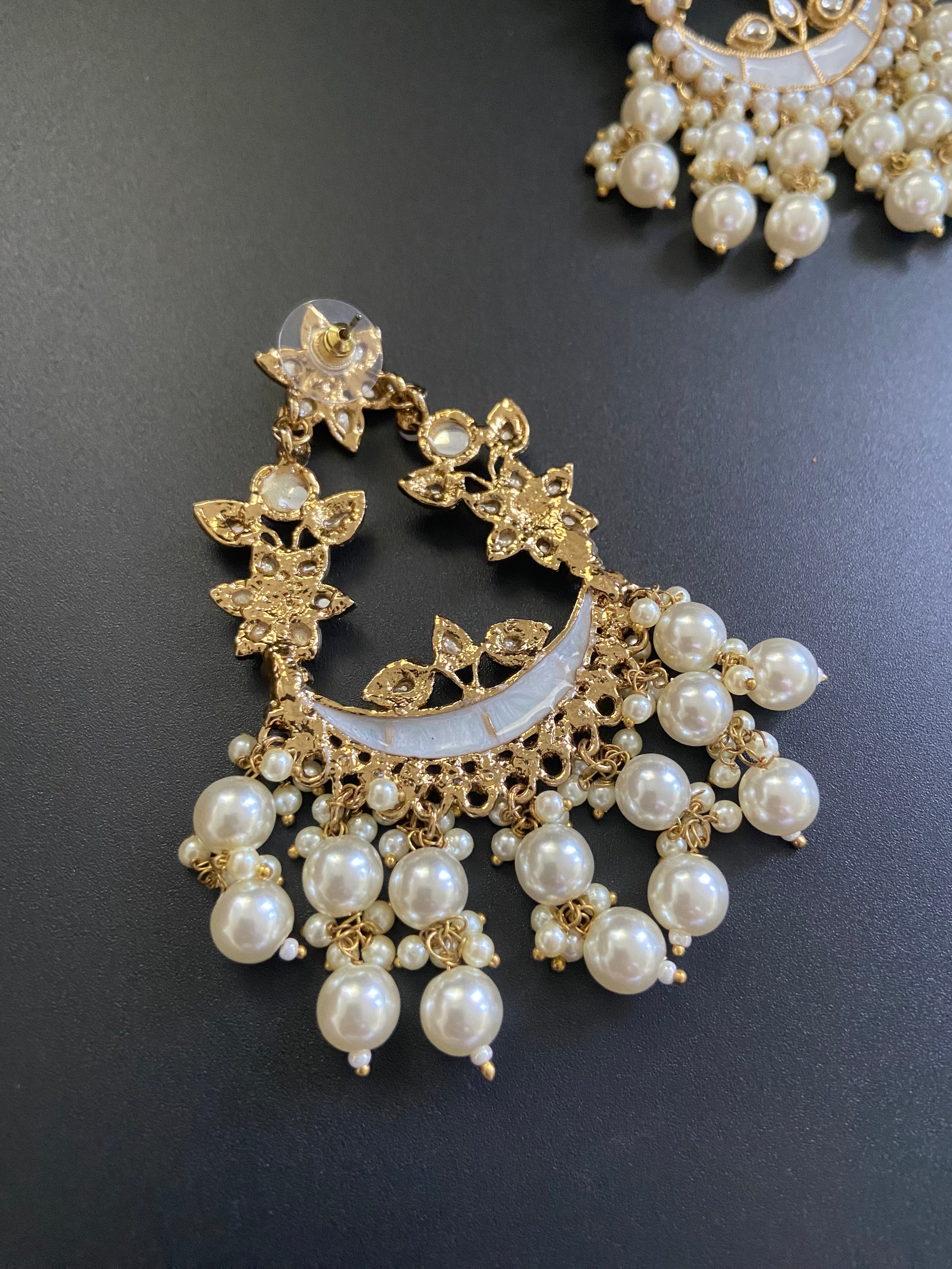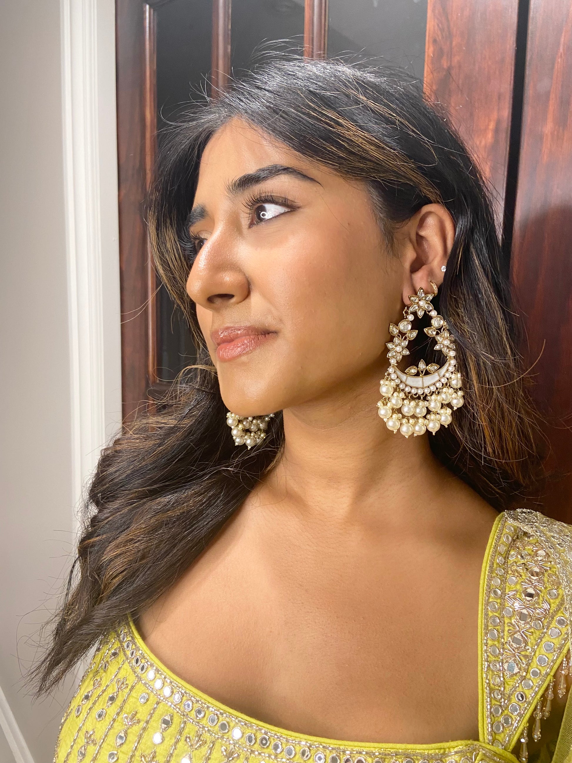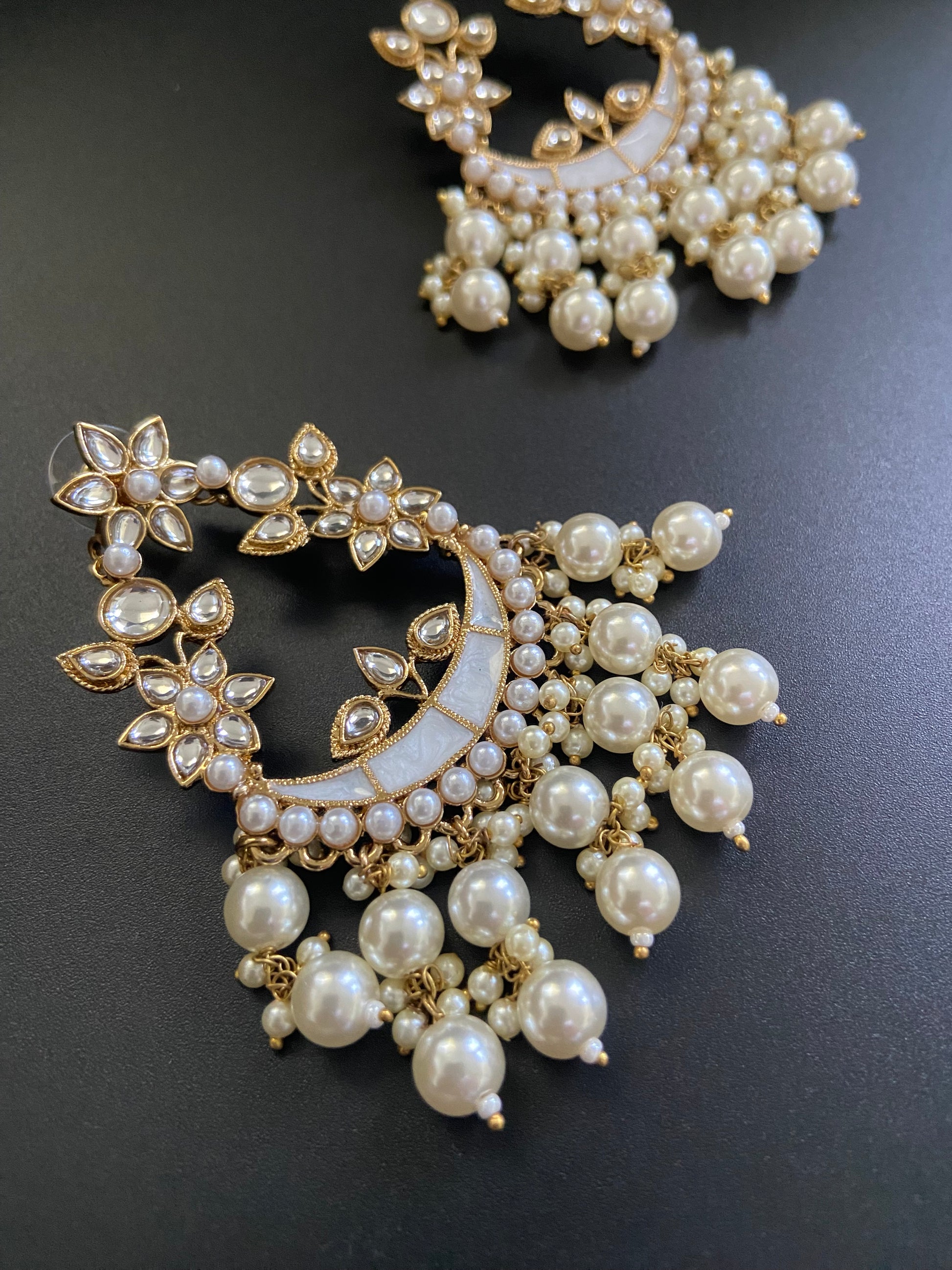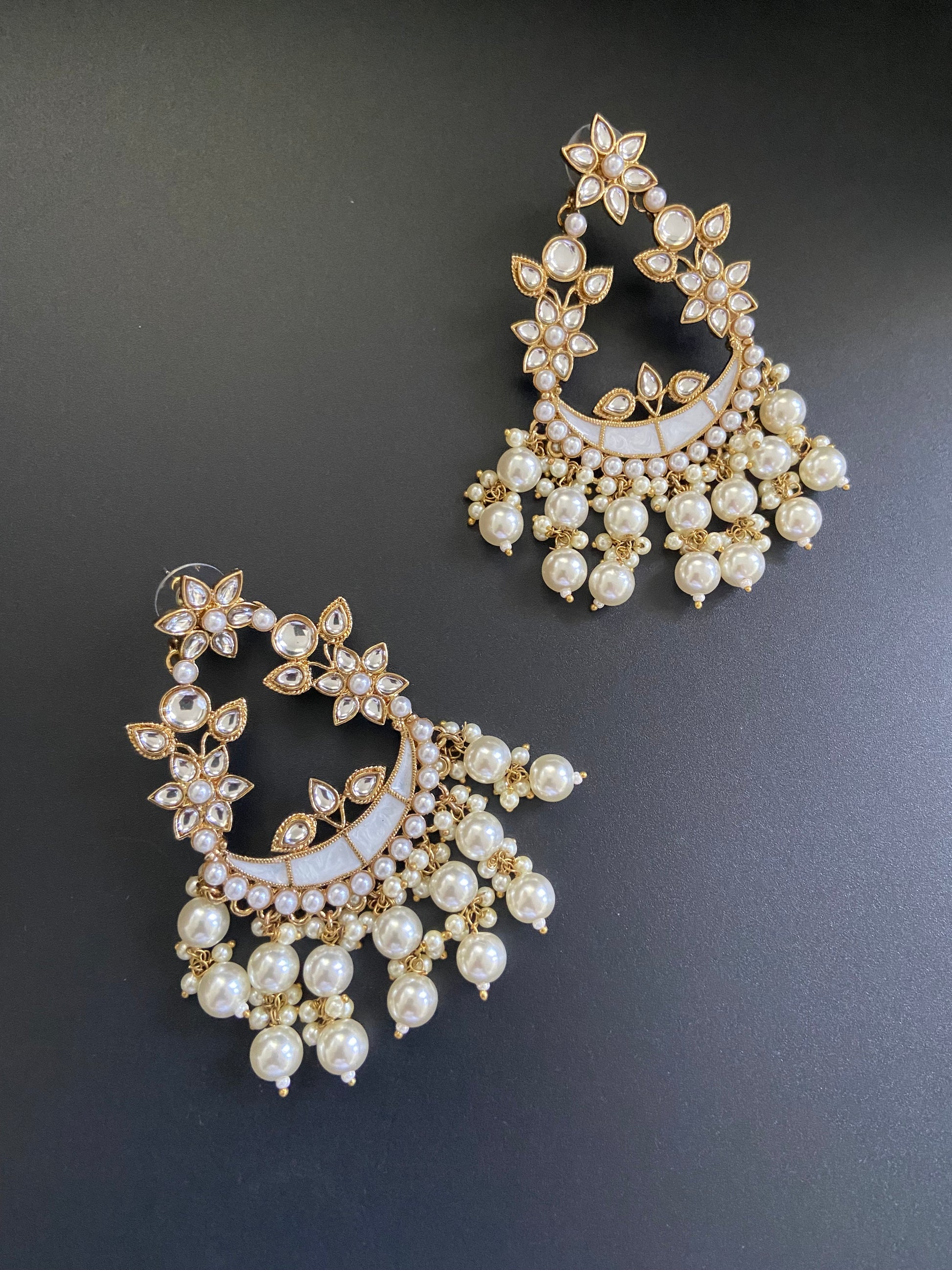 Discover the beauty of our pearly earrings, crafted with an intricate floral design in a soft, subtle shade. The subtle shade complements any ensemble, making these earrings a versatile addition to your wardrobe. Perfect for weddings and festive celebrations, they add a touch of elegance and sophistication, ensuring you look gorgeous on every occasion.