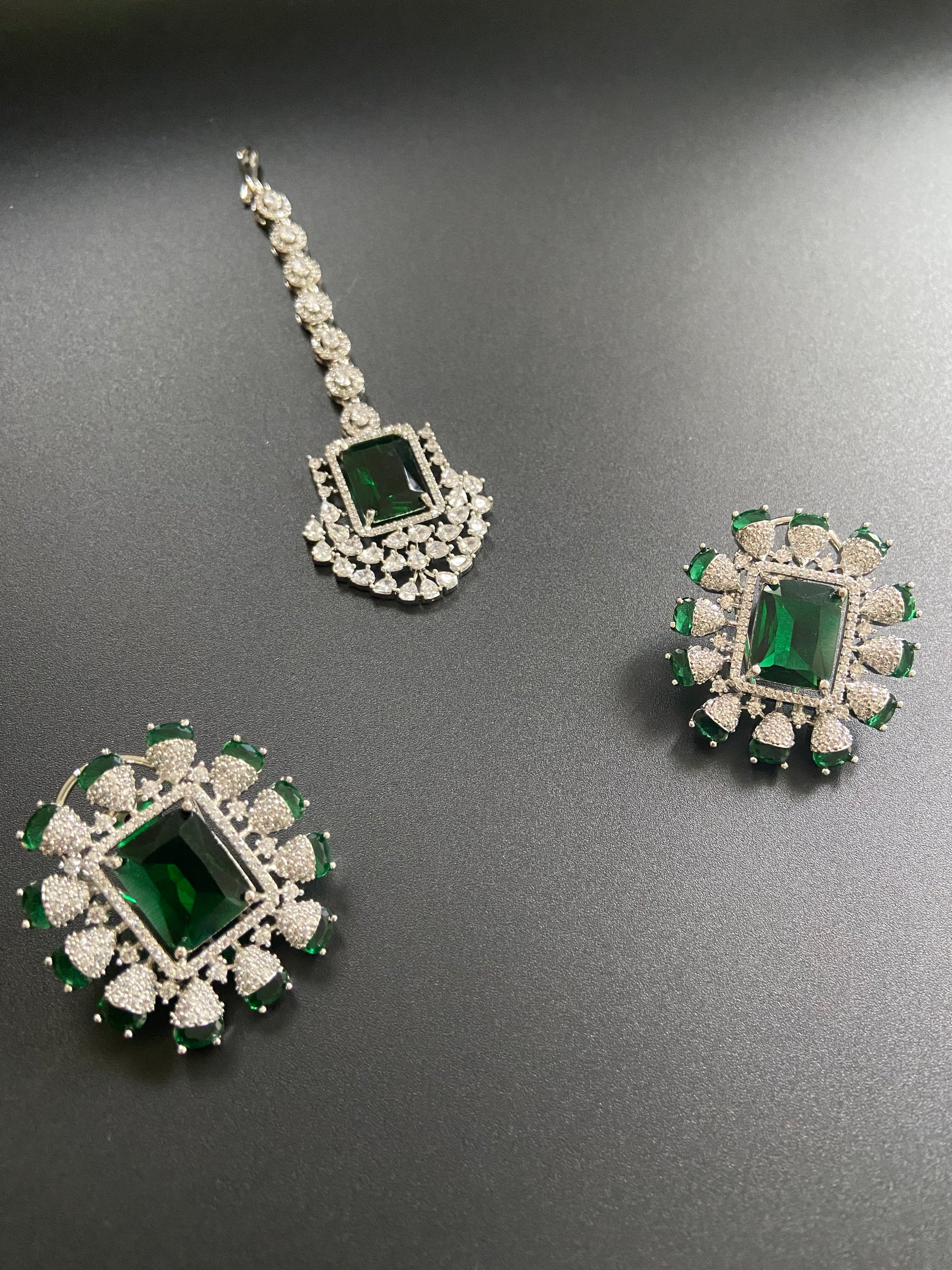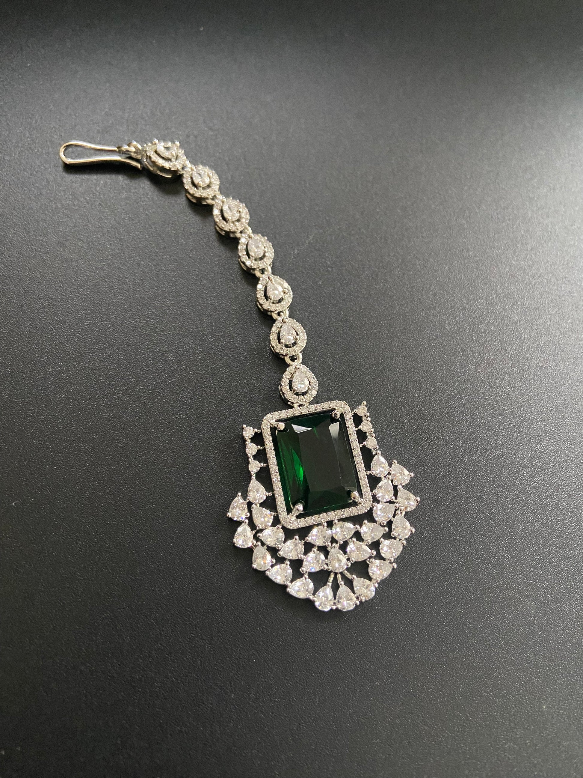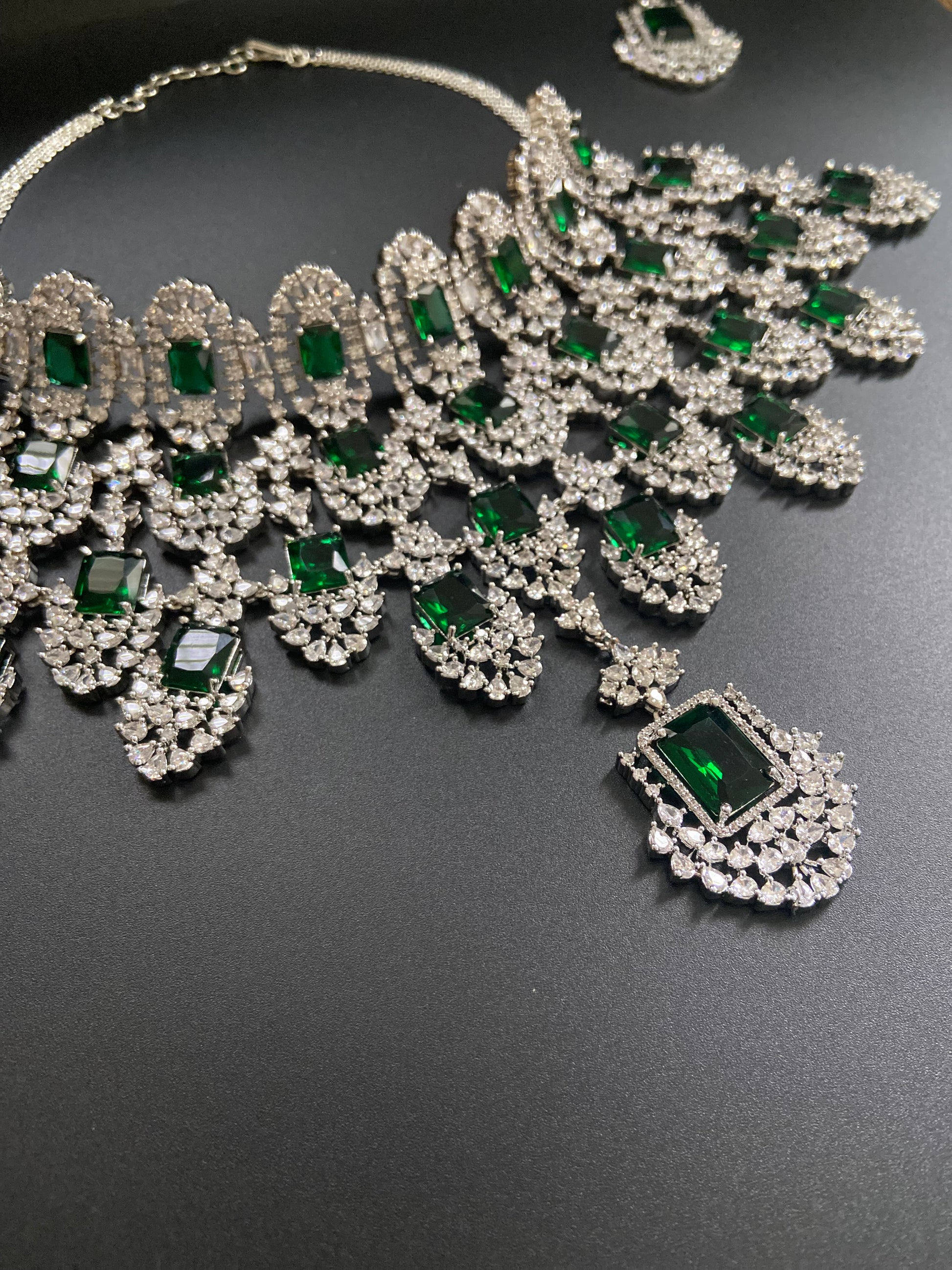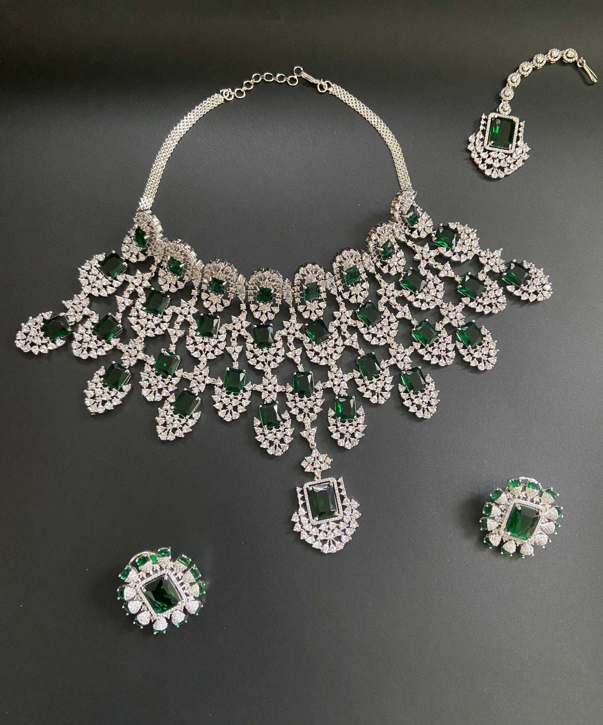 Inspired by Kiara Advani’s wedding necklace set, this gorgeous piece is adorned with radiant emerald green stones, this mesmerizing statement piece is a celebration of elegance. The set, complemented by matching earrings and a maang tika, offers a harmonious balance of traditional allure and modern aesthetics.
