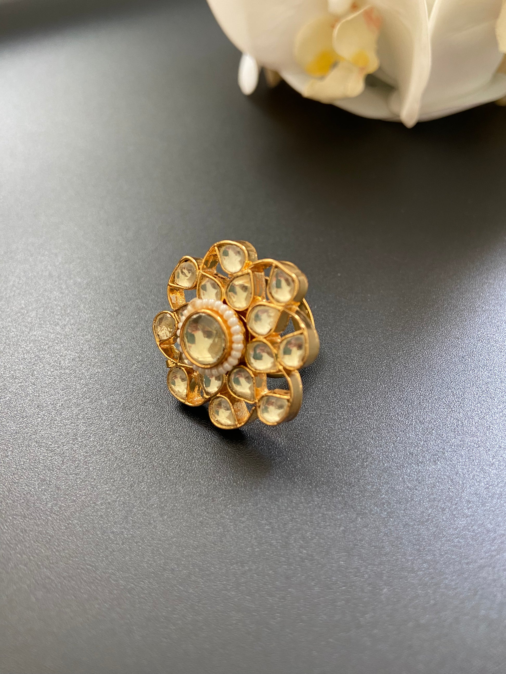 Introducing our handcrafted Floral Ring, a modern marvel of elegance. This statement piece features a pretty floral design with an outline of lustrous pearls at its center. Meticulously crafted with intricate Kundan work, it exudes regal allure while embracing contemporary style. This ring is a perfect blend of tradition and modernity, making it the ideal accessory to complement any outfit.