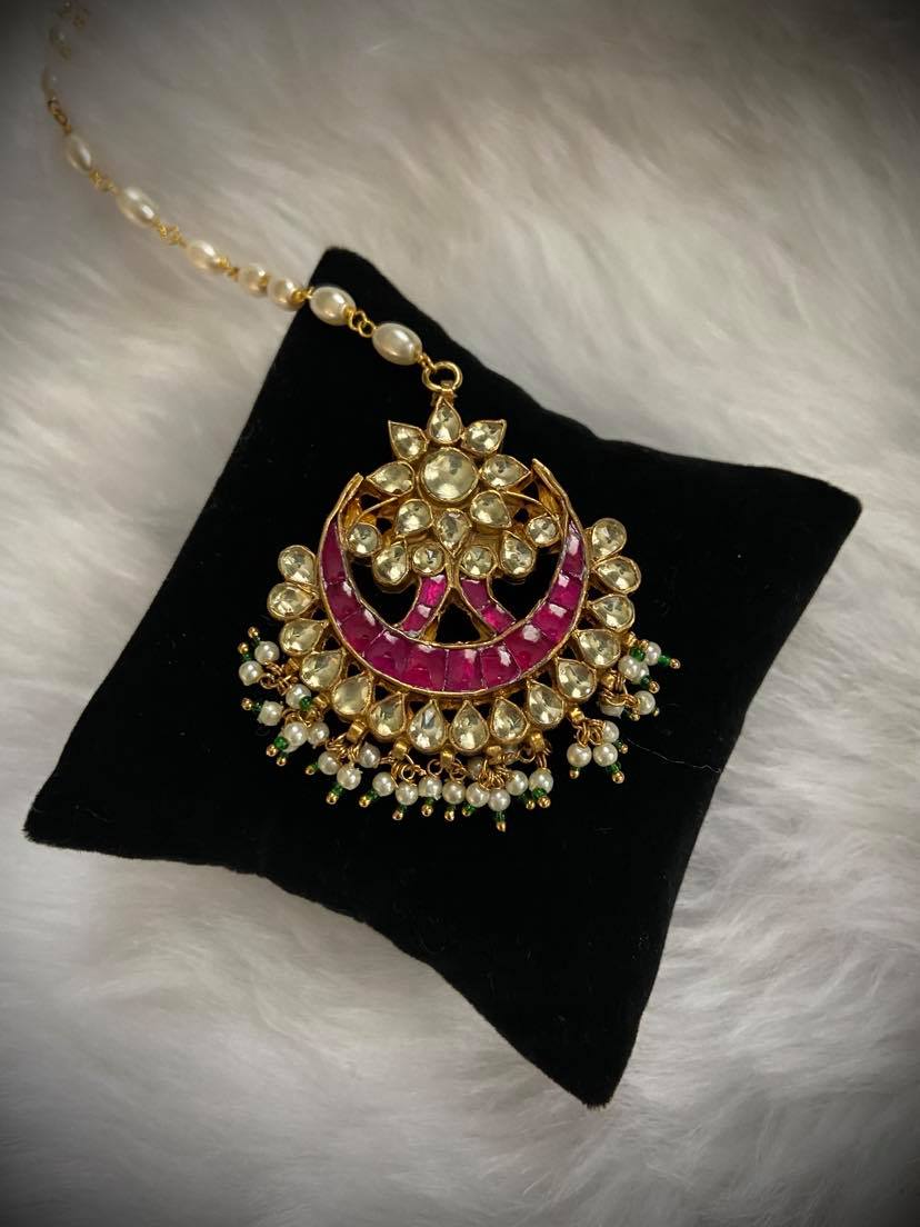 The inspiration for this piece was the Chandbali form. Add this elegant and statement Kundan Maang tikka to your wedding trousseau or festive wear wardrobe to accessorize your Indian looks with ease. Exquisitely made by hand with utmost attention to details.