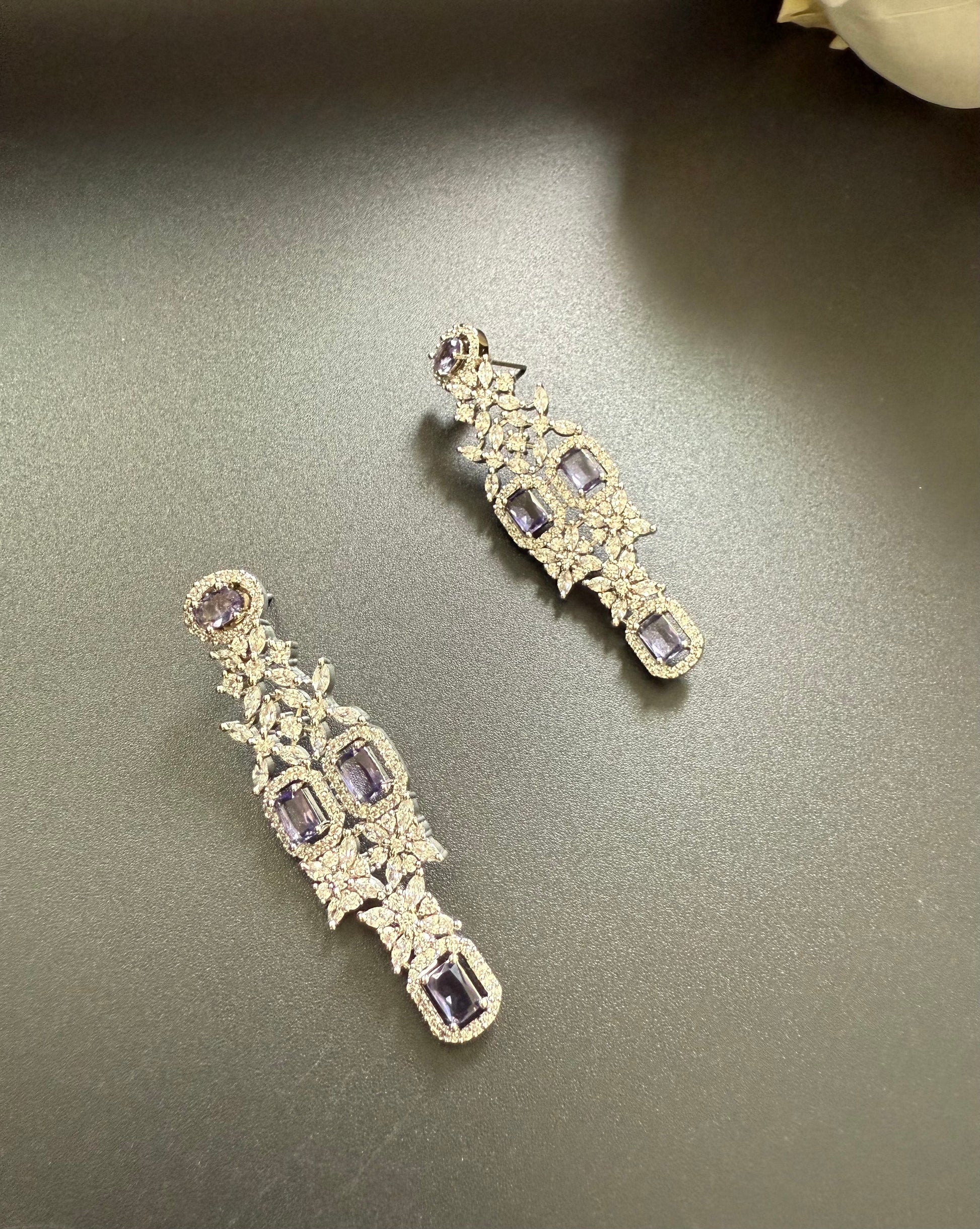 A striking statement in silver tones, this necklace set showcases dual layers of finely set stones. The top layer features oval-cut violet gems bordered by intricate detailing, while the lower tier is lined with a series of rectangular light purple-hued stones, creating a graceful rhythm. Paired with matching drop earrings that echo the same symmetry and design, this set brings a refined sense of elegance.