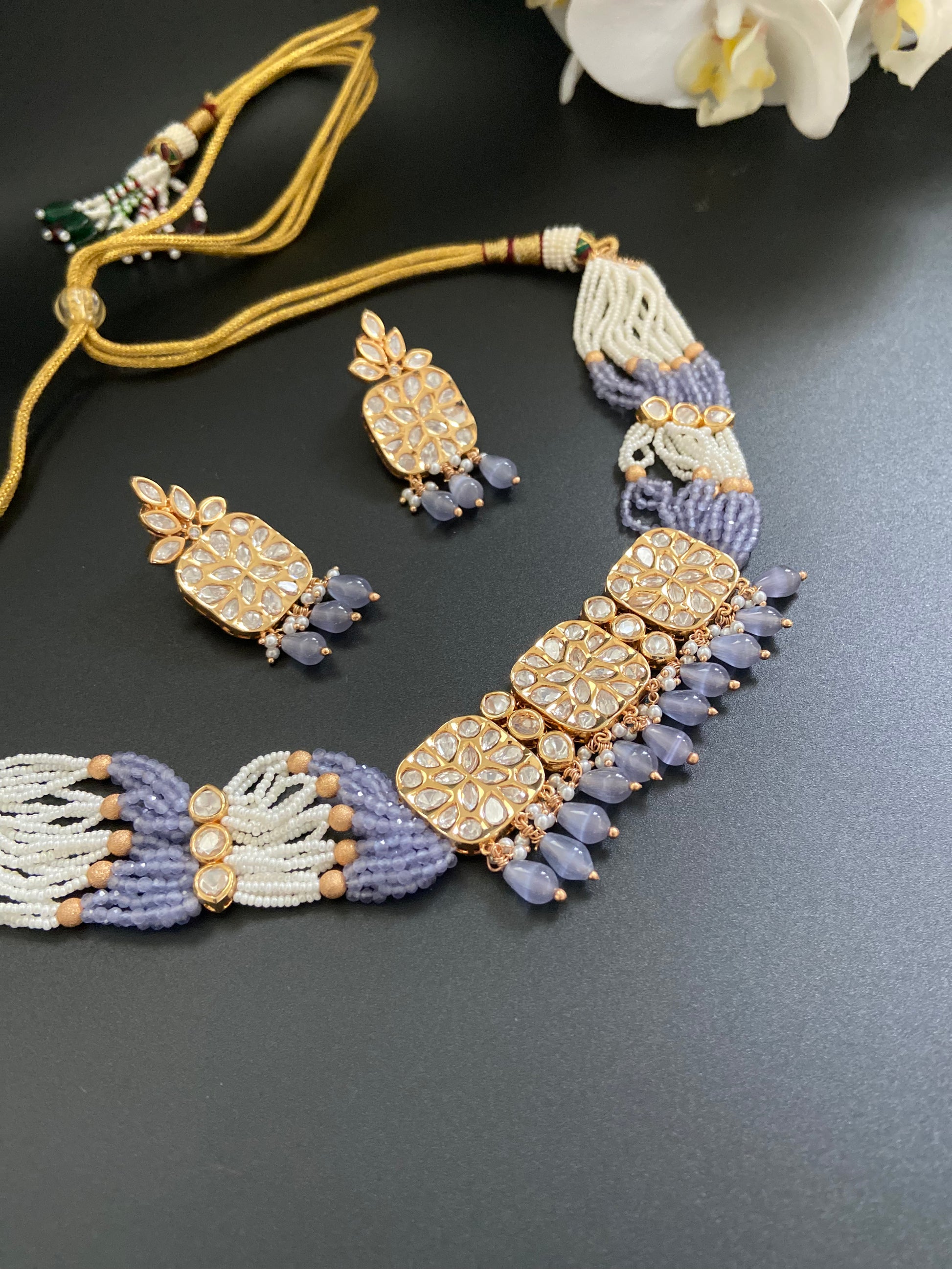 A gorgeous synthesis of colors and textures, this choker set is delicate, unique and absolutely beautiful. It features back-setting kundan that is the perfect complement to the lilac grey beads, crystals, and baby pearls, adding an extra layer of dimension and depth to the set The intricate details of the hand-stranded design gives it a one-of-a-kind look that is sure to impress.