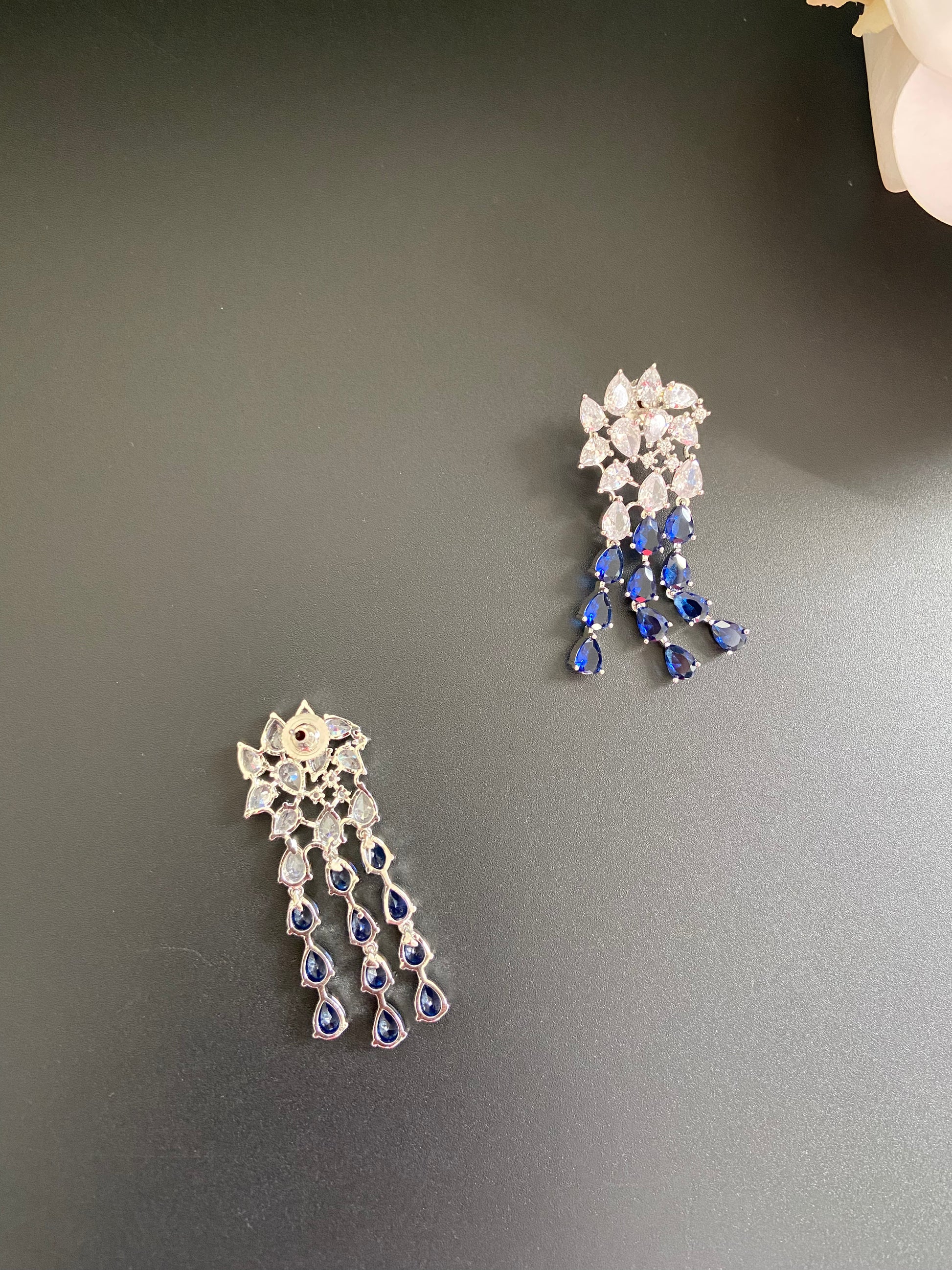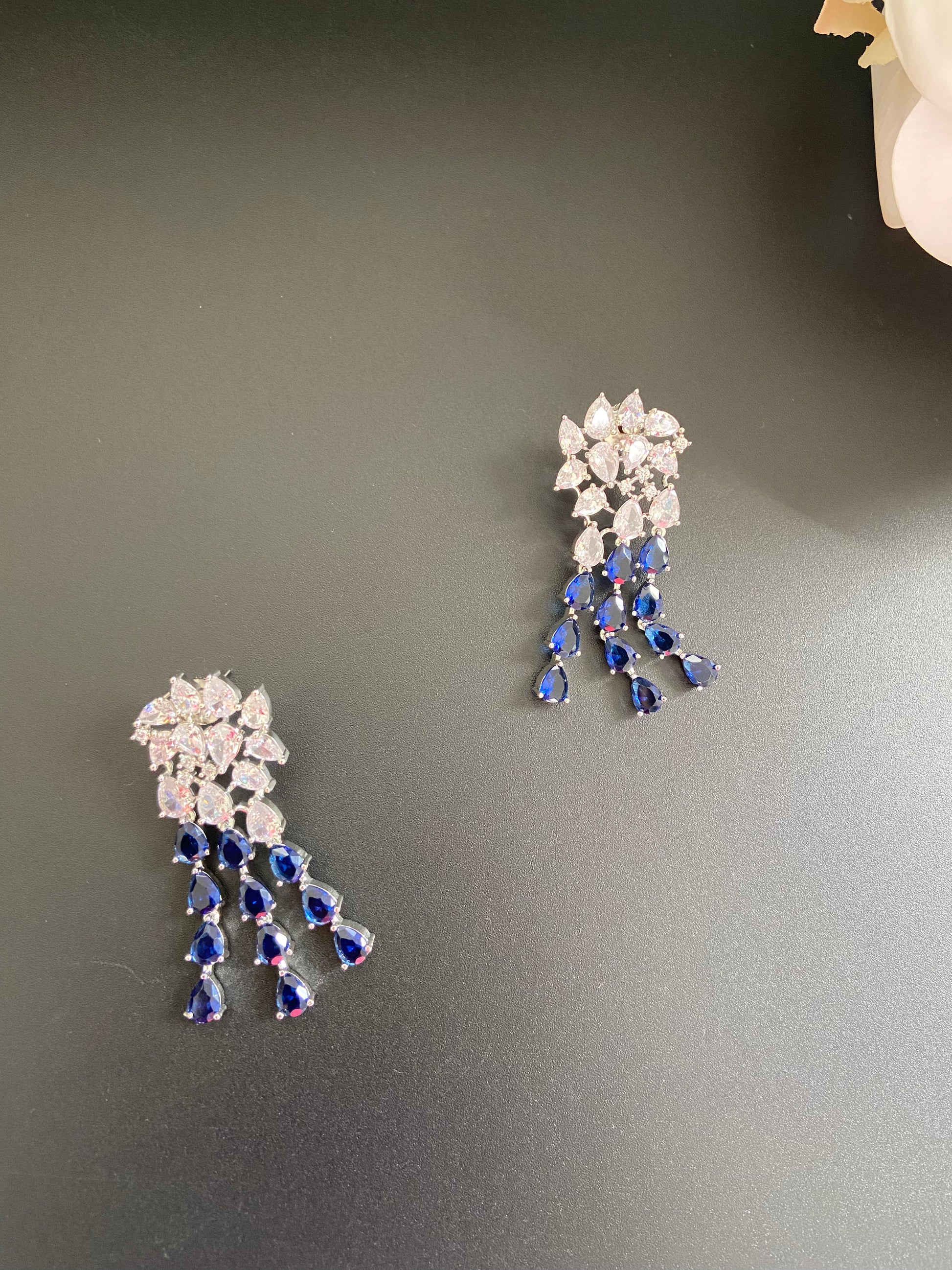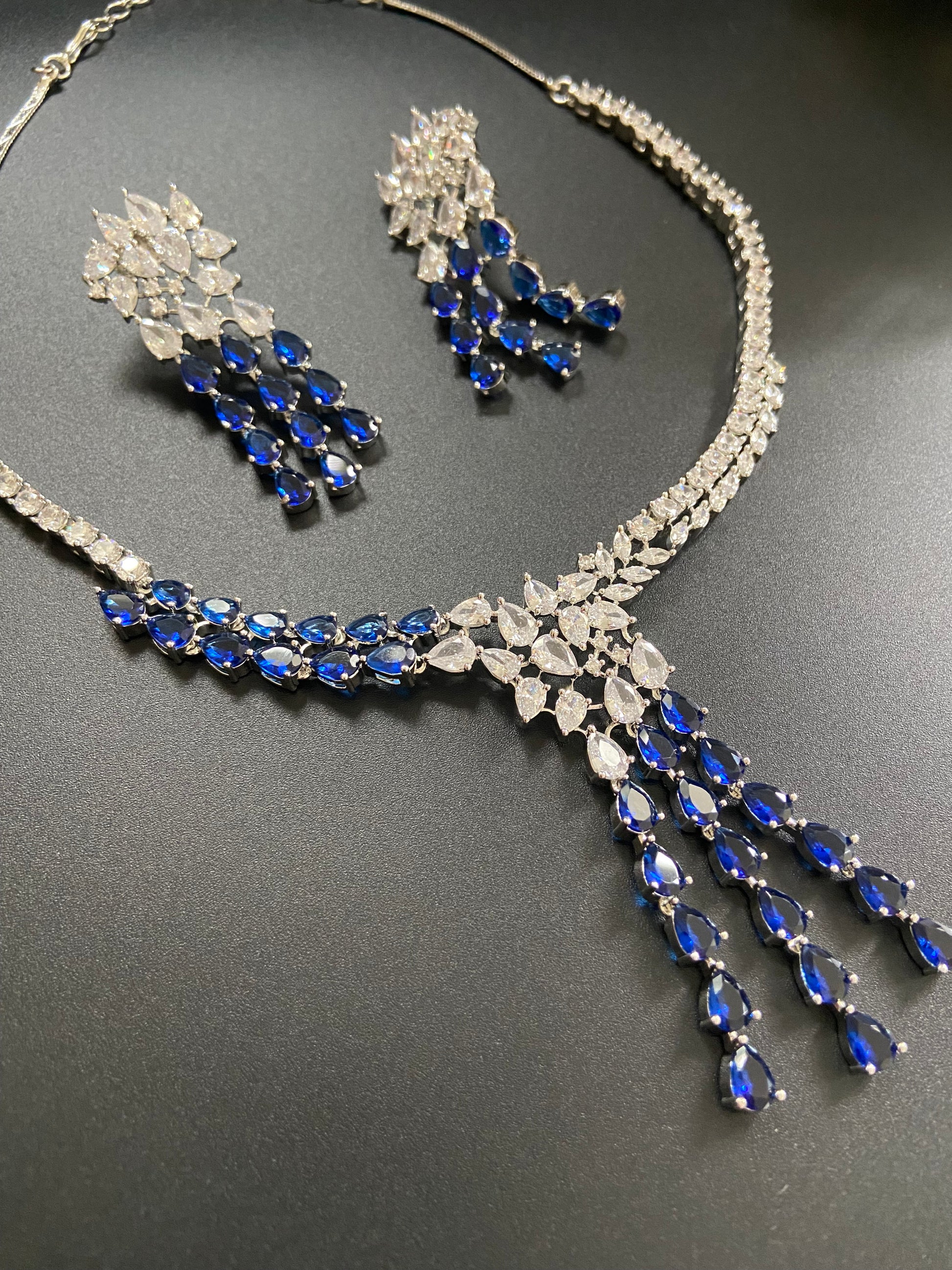 Step into a world of modern elegance with this gorgeous necklace set, where contemporary design meets artistic flair. The unique blend of vibrant blue and sparkling clear stones creates a captivating contrast. Its sleek and fluid design offers a fresh take on fashion, perfect for those who seek something beyond the ordinary. Comes with matching earrings.
