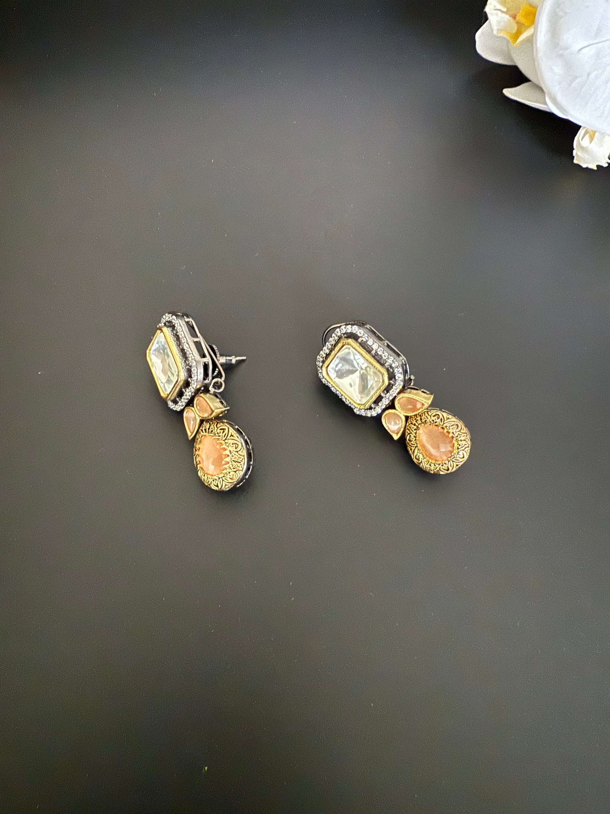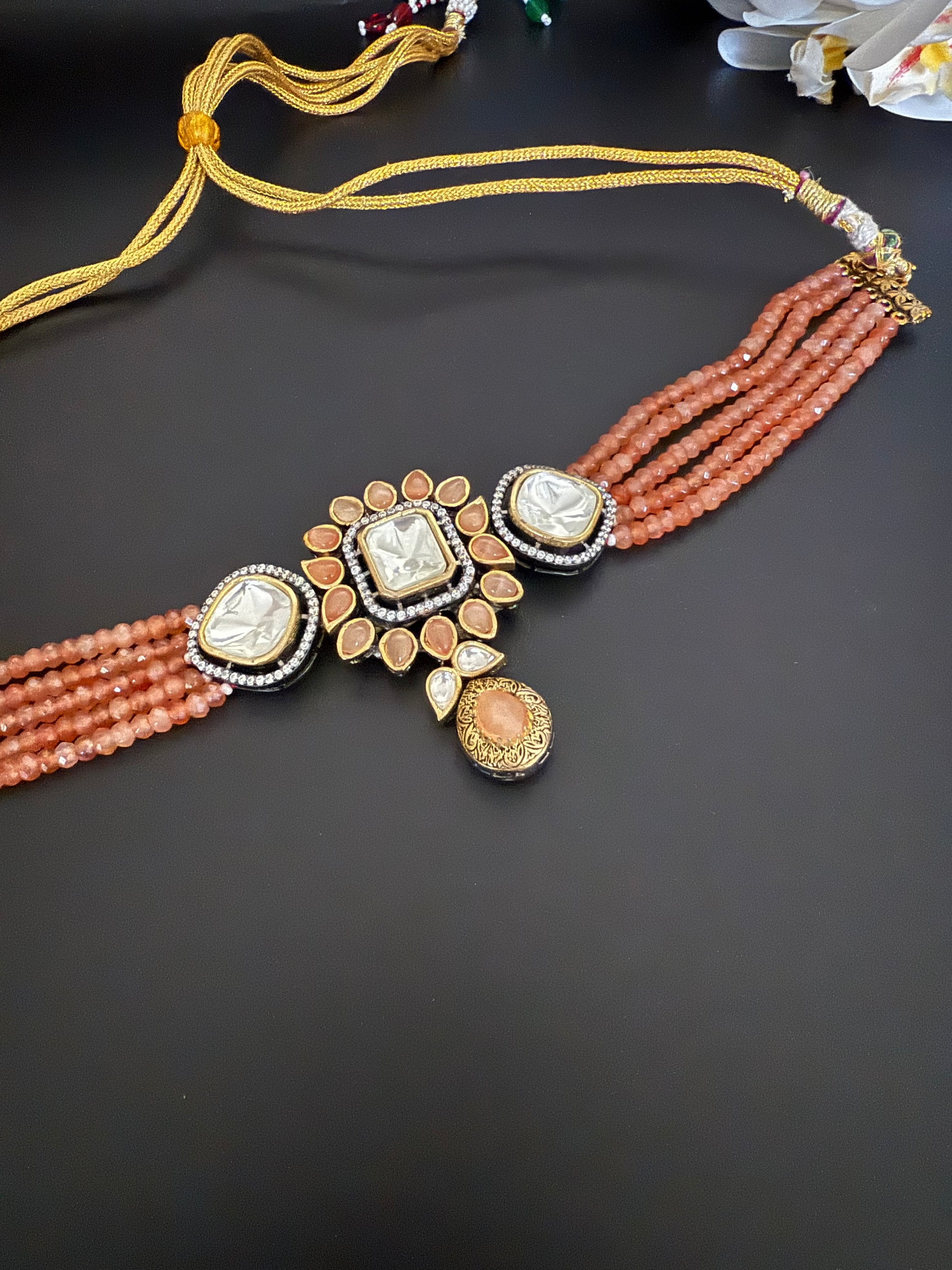 Set in rich Victorian-style, this choker features lustrous peach-hued beads intricately strung in multi-layered rows, culminating in a bold centerpiece of uncut polki-style kundan stones. Each stone is framed in antique-finish detailing, giving it a heritage feel that’s both regal and timeless. Comes with matching earrings.