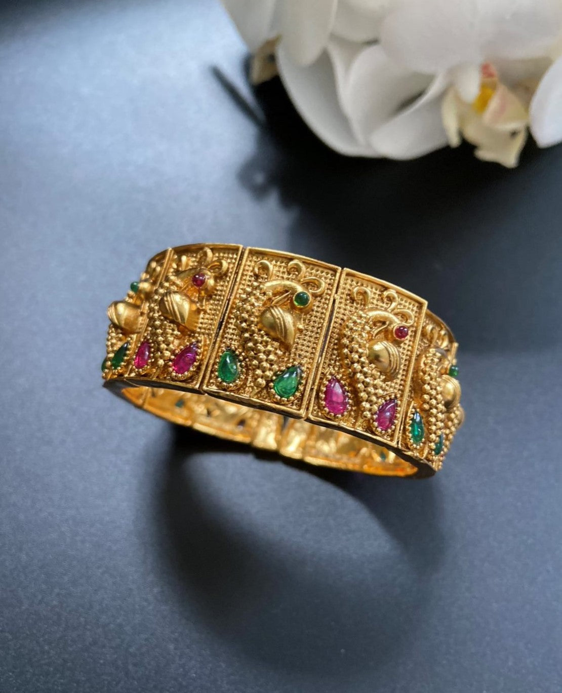 Presenting Beautiful stretchable classic carved antique bangle features Ruby and Green color stones and filigree work.