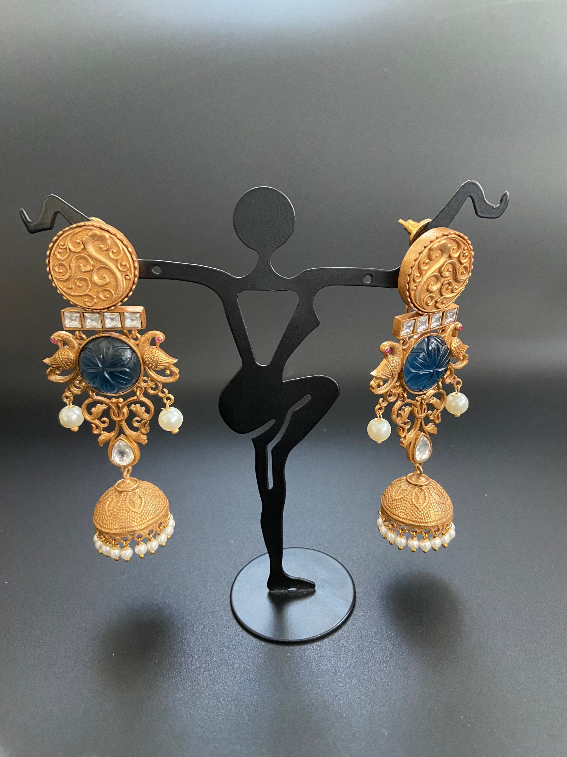 These stunning peacock kundan earrings are the epitome of elegance and tradition. Featuring an intricately engraved dark grey center, they are adorned with graceful peacock motifs, surrounded by lustrous kundan stones and delicate pearls. The matt gold finish adds a vintage touch to the design, making these earrings a perfect choice for festive occasions. Their traditional charm and detailed craftsmanship make them a statement piece that complements ethnic wear beautifully.
