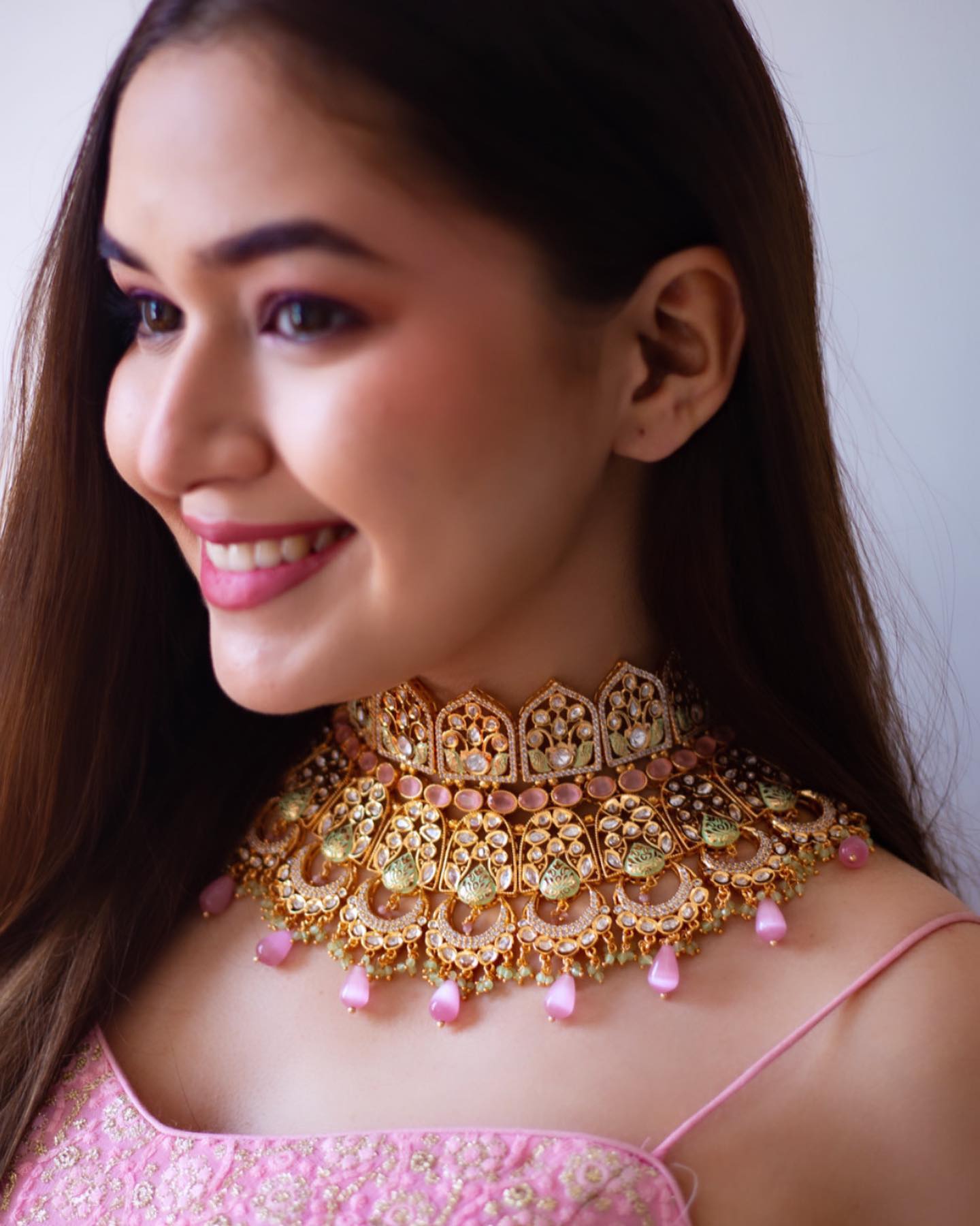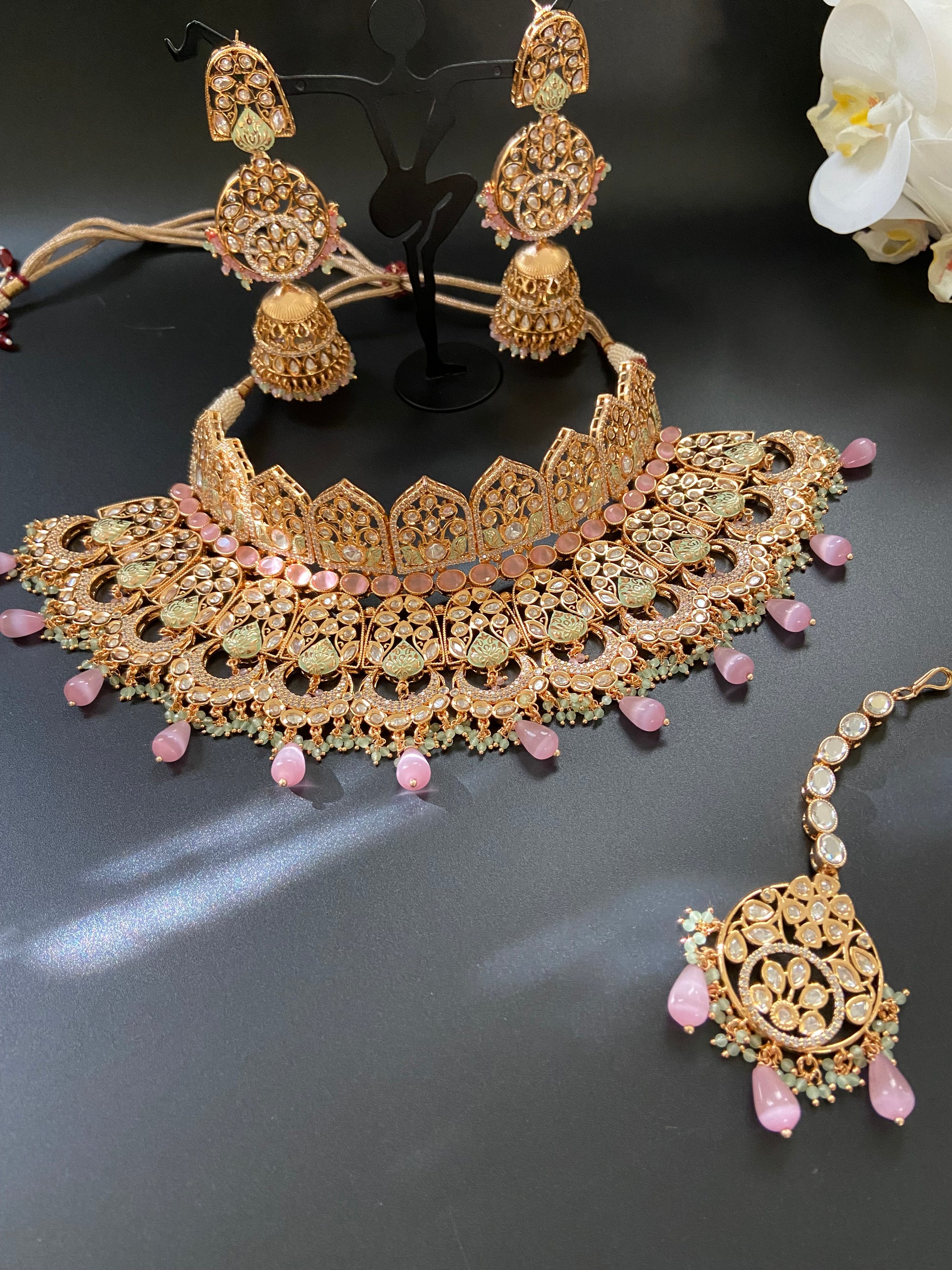 A beautiful interplay of Kundan and Meenakari work, this choker set lets you experience regality. With intermingling tints of pink and mint, it is embellished with beads and crystals and will give you a look that'll help you make a statement. Comes with matching push post earrings and a matching Maang tikka.