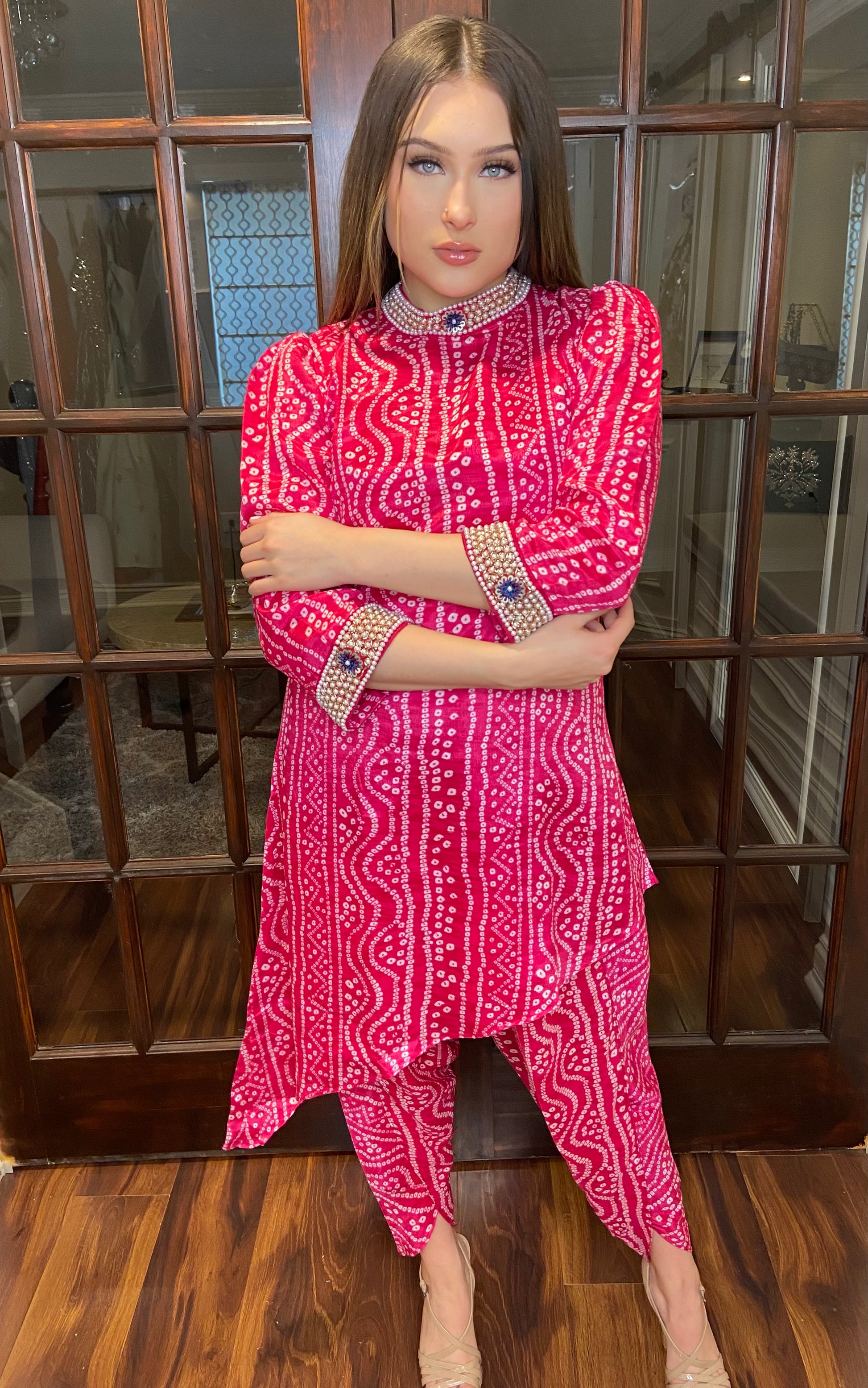 Embracing the comfort in fashion, this vibrant ensemble will have you looking absolutely glam. Dipped in the beautiful Bandhani print, it features an asymmetrical kurta paired with tulip pants.