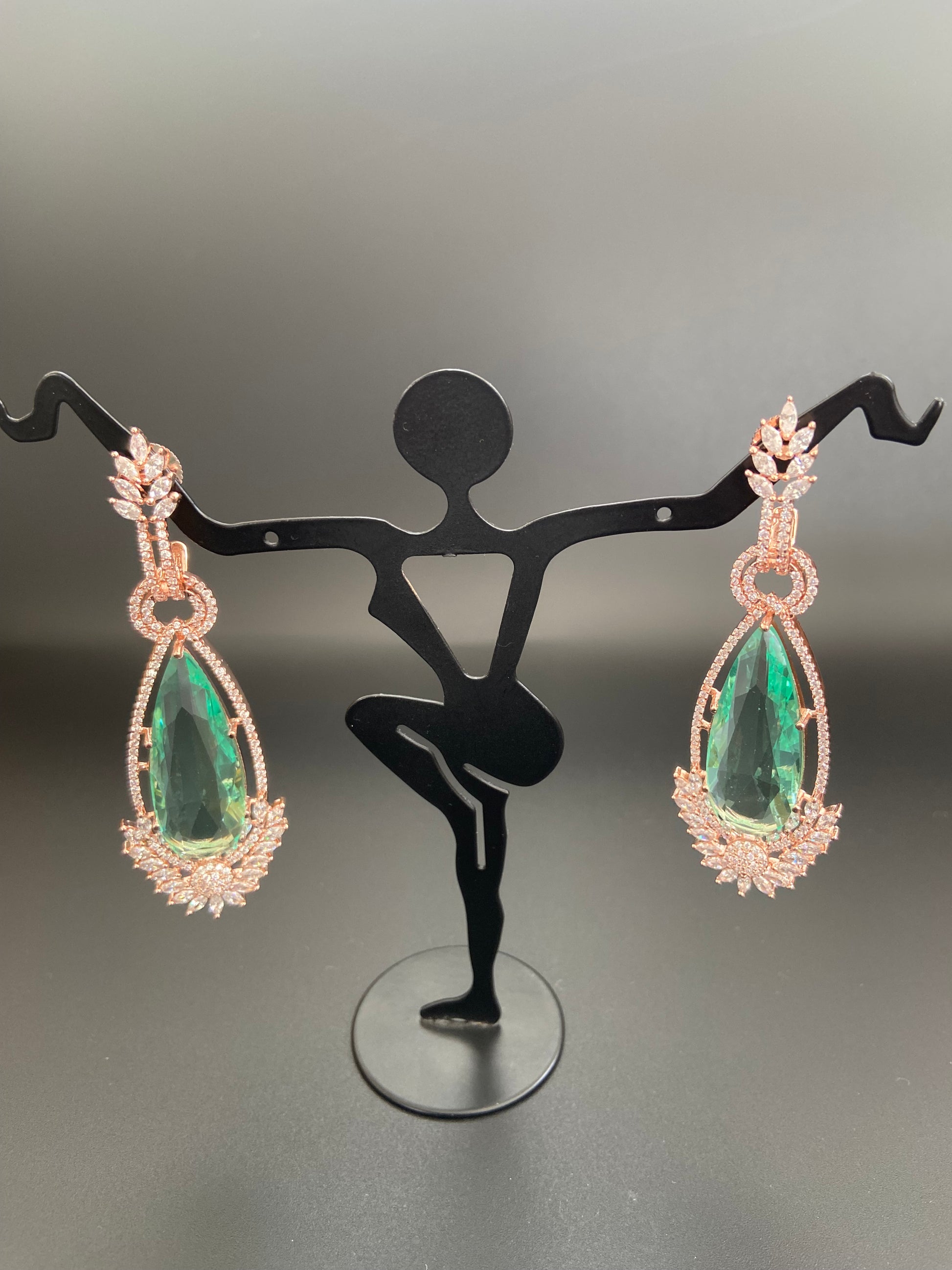 Immerse yourself in grace with these exquisite rose gold earrings featuring captivating sea-green crystals at their heart. Surrounded by a delicate arrangement of sparkling stones, the teardrop design exudes a timeless charm. Perfect for evening soirées, weddings, or festive occasions, these earrings are a must-have for those who love a blend of glamour and sophistication.
