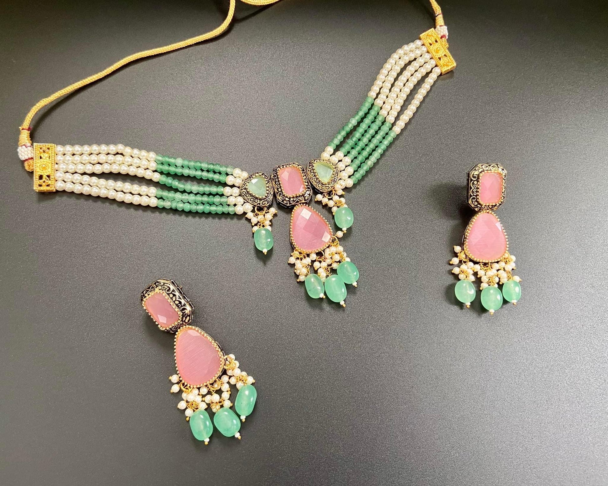 Rich tints of mint, white and pink intermingle in this beautiful choker set.