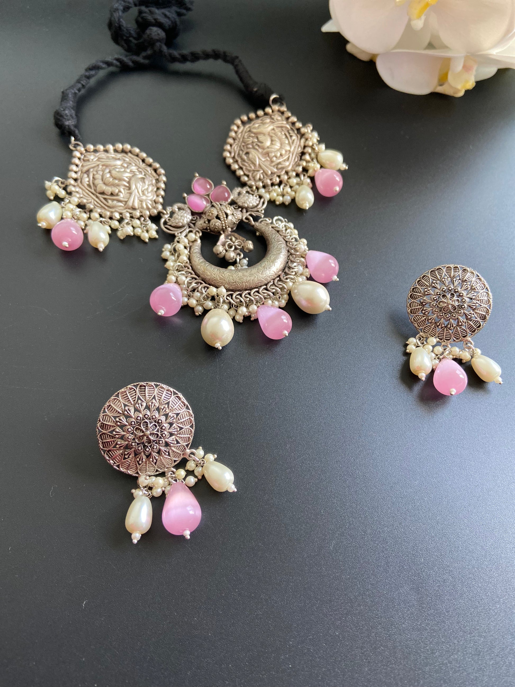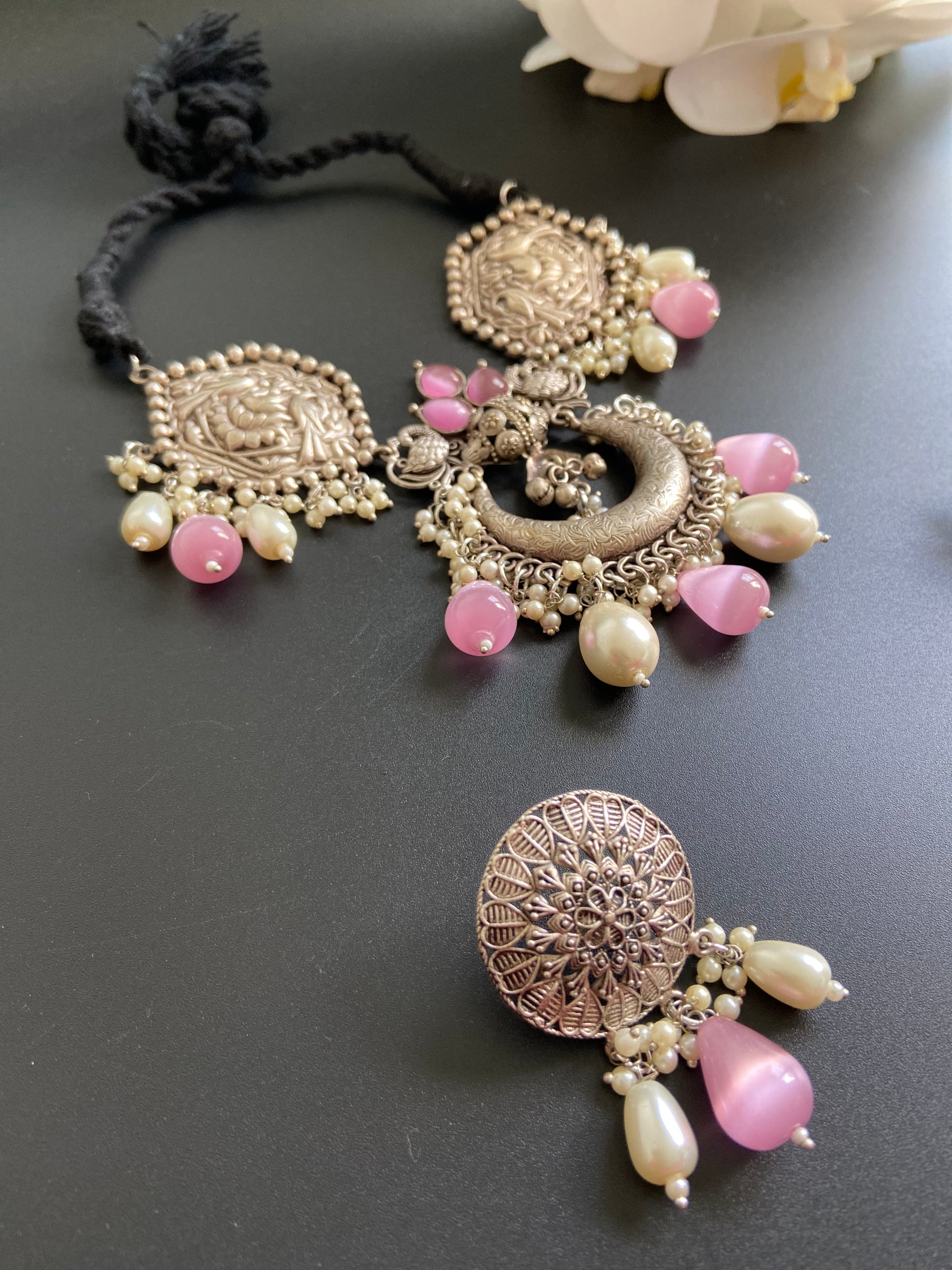 Steal all the spotlight with our super light weight choker set. Adorned with pearl and glass beads and trinklets. It also features matching earrings. It is German silver alloy and is thoughtfully detailed to reflect our beautiful earth and its dark and light hues.