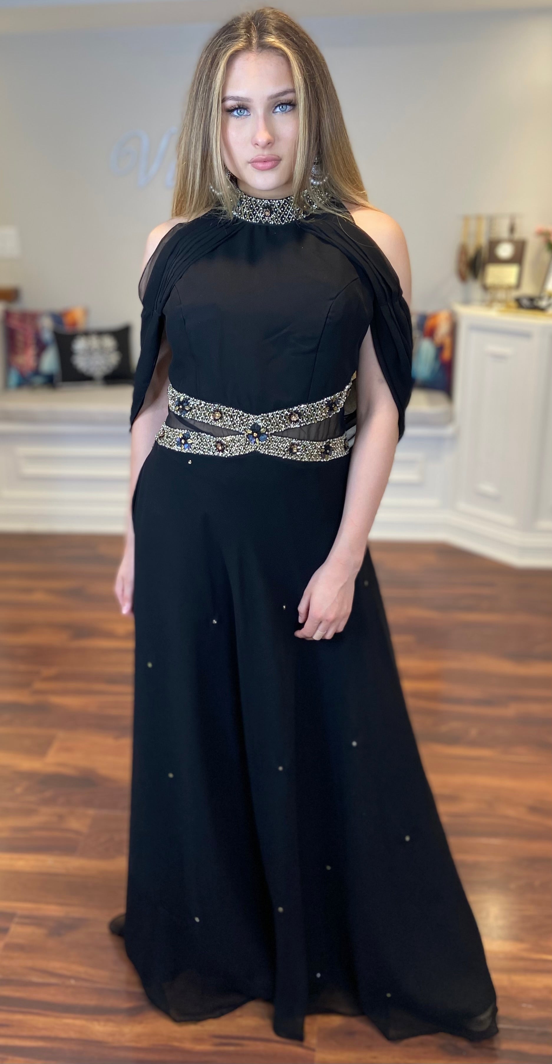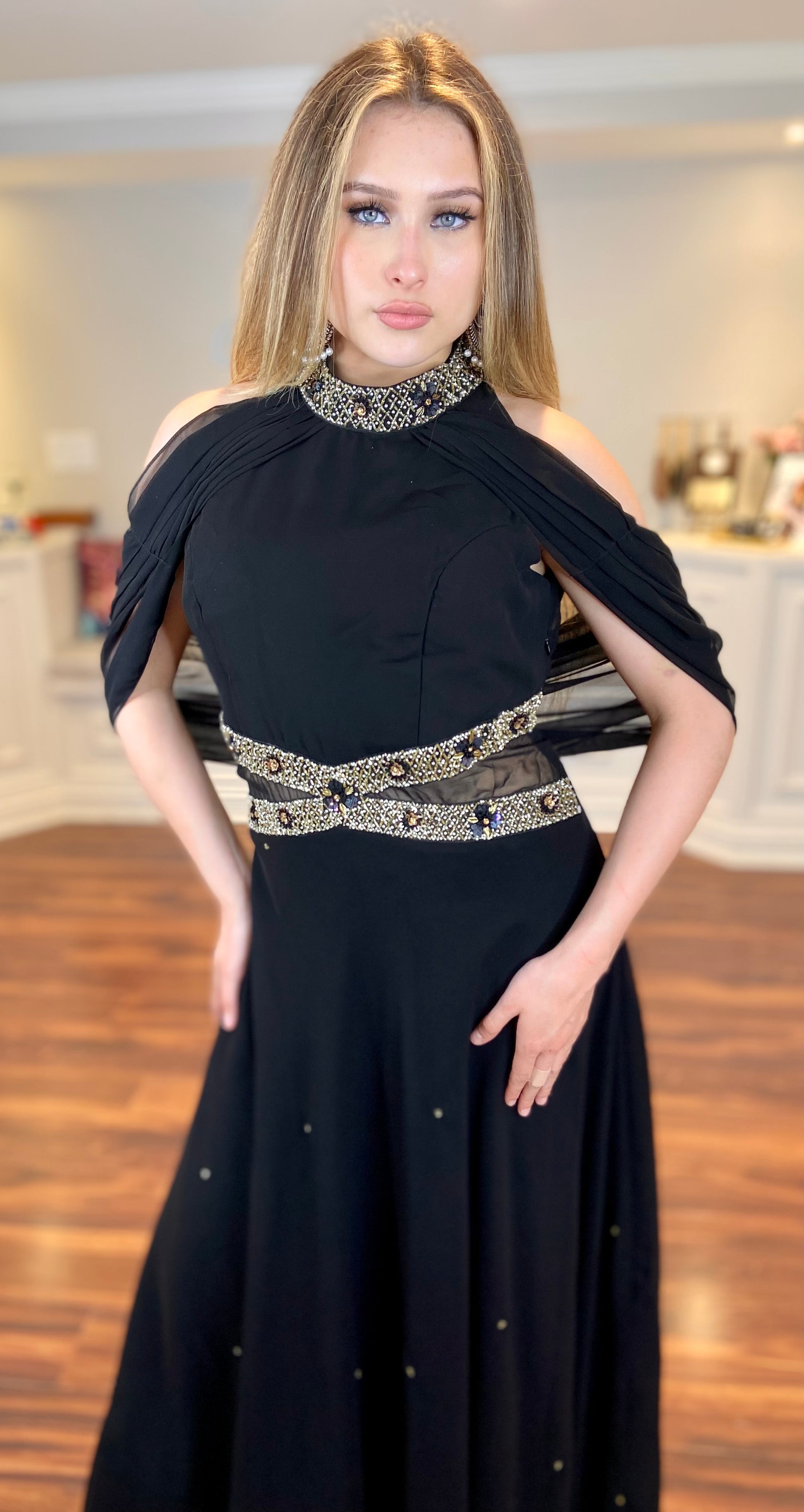 This unique single piece fusion cape halter ensemble in Black comes with an attached arm wrapped cape, with florals hand embroideries using cut dana, beads work crystals and multihued sequins on the collar and the cross- waist areas. The waist is accentuated with a partial sheer translucent look and the legs through spaced out tiny cut dana embellishments.