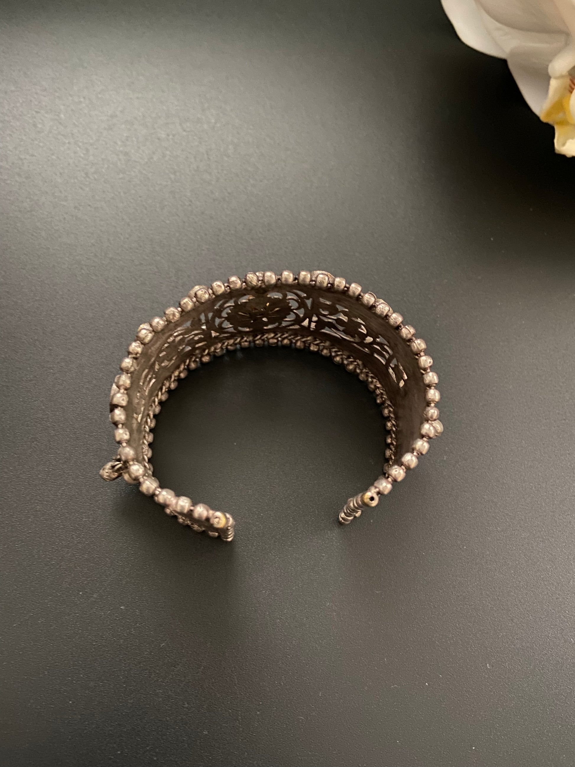 A mix of cut out details and beautiful motifs and ghungaroo, this Kada is perfect to add a touch of glam to your outfit. With German Silver as a base, with Kundan settings and has pink colored center stones in a lovely lotus setting.