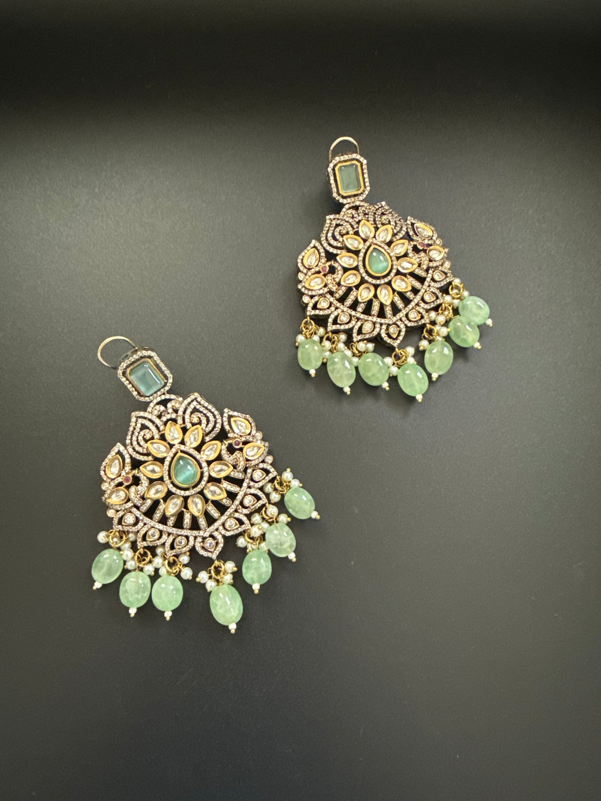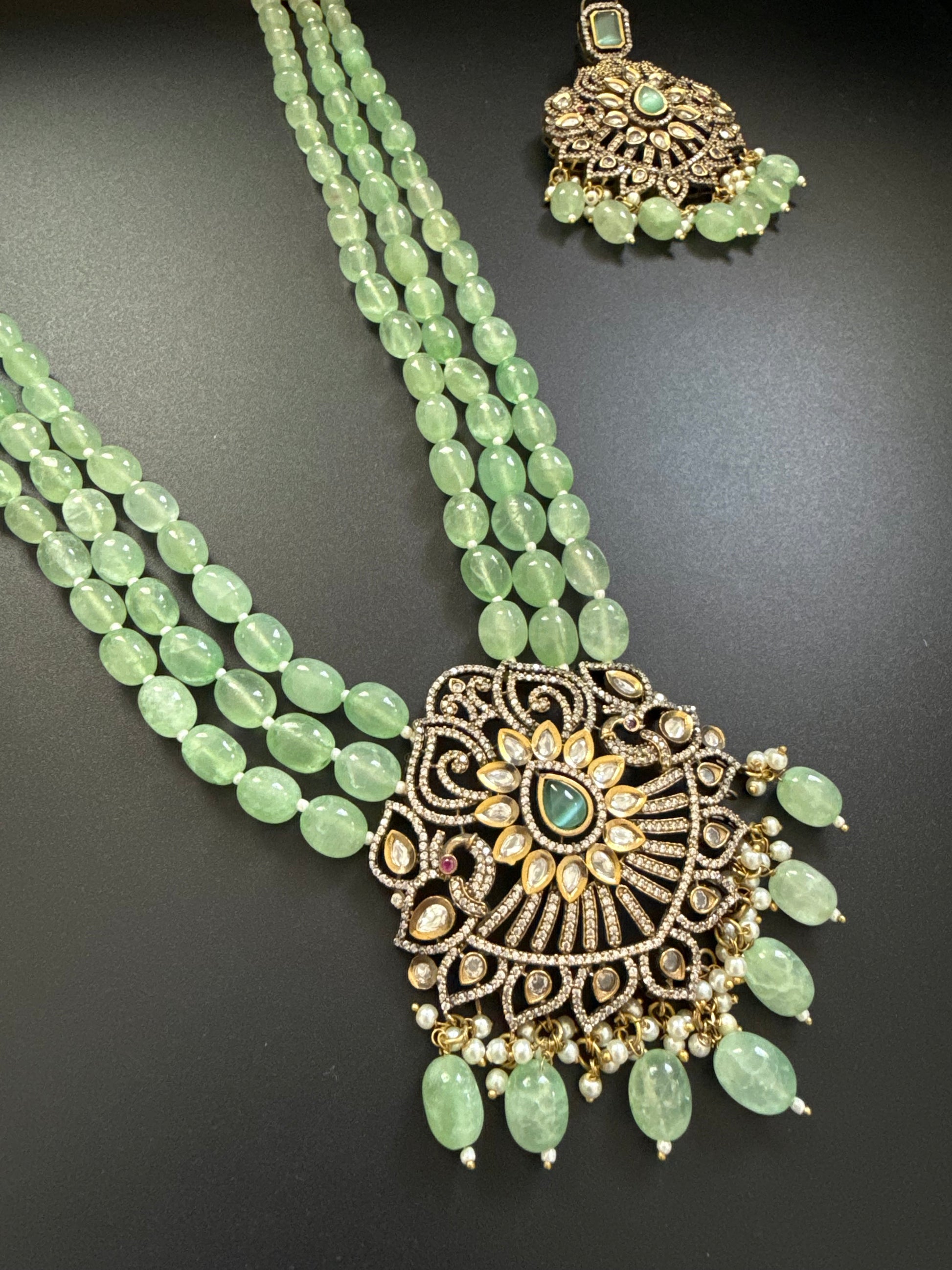 Cool-toned and quietly striking, this sea green necklace set is a refined take on Victorian charm. The design pairs layered glassy beads with a detailed pendant and earrings—finished in antique tones and highlighted with kundan work. The centrepiece features a soft sea green gem surrounded by intricate floral detailing, while bead drops add a gentle finish. Perfect for festive dinners, mehendi functions and much more.