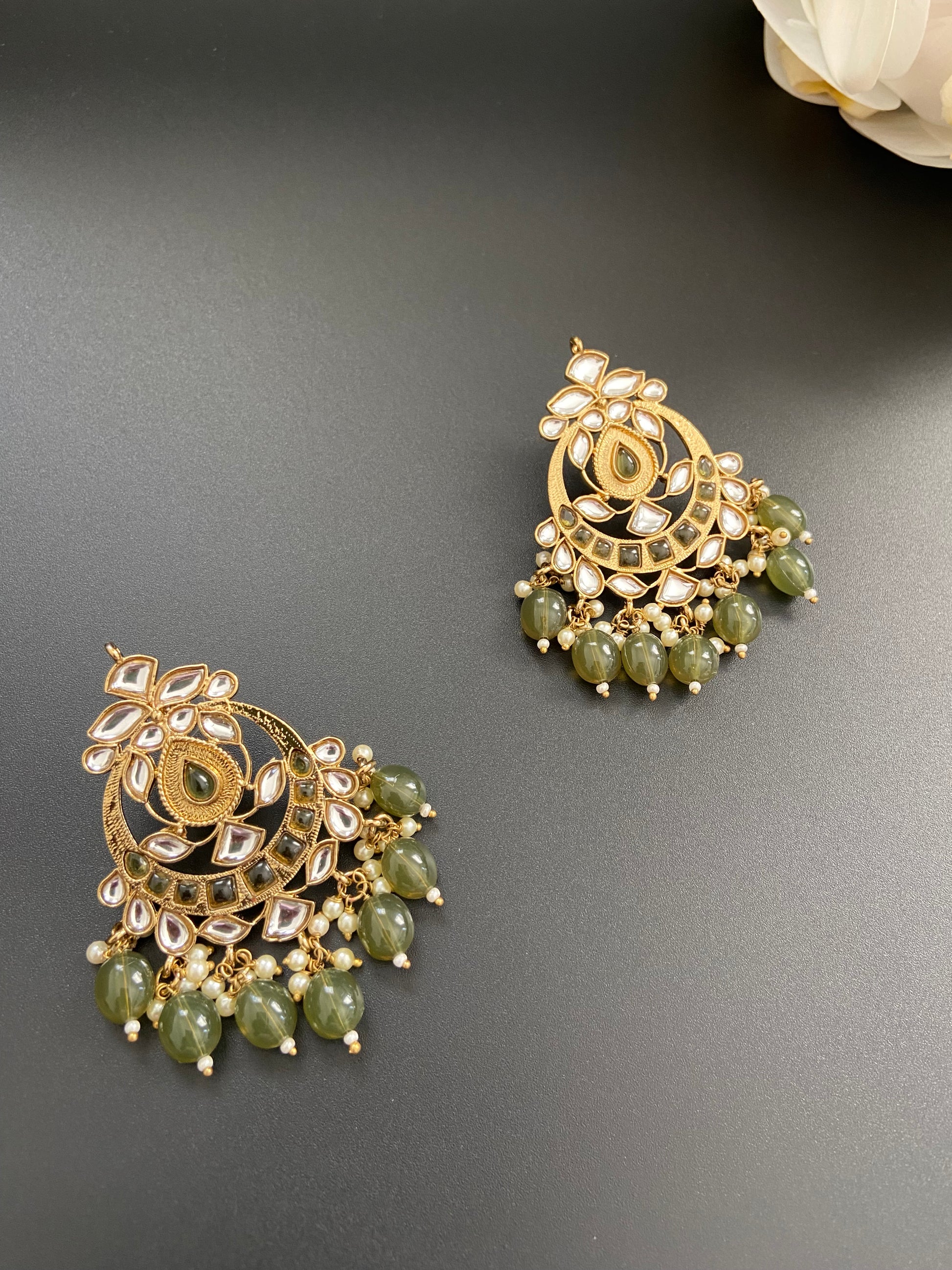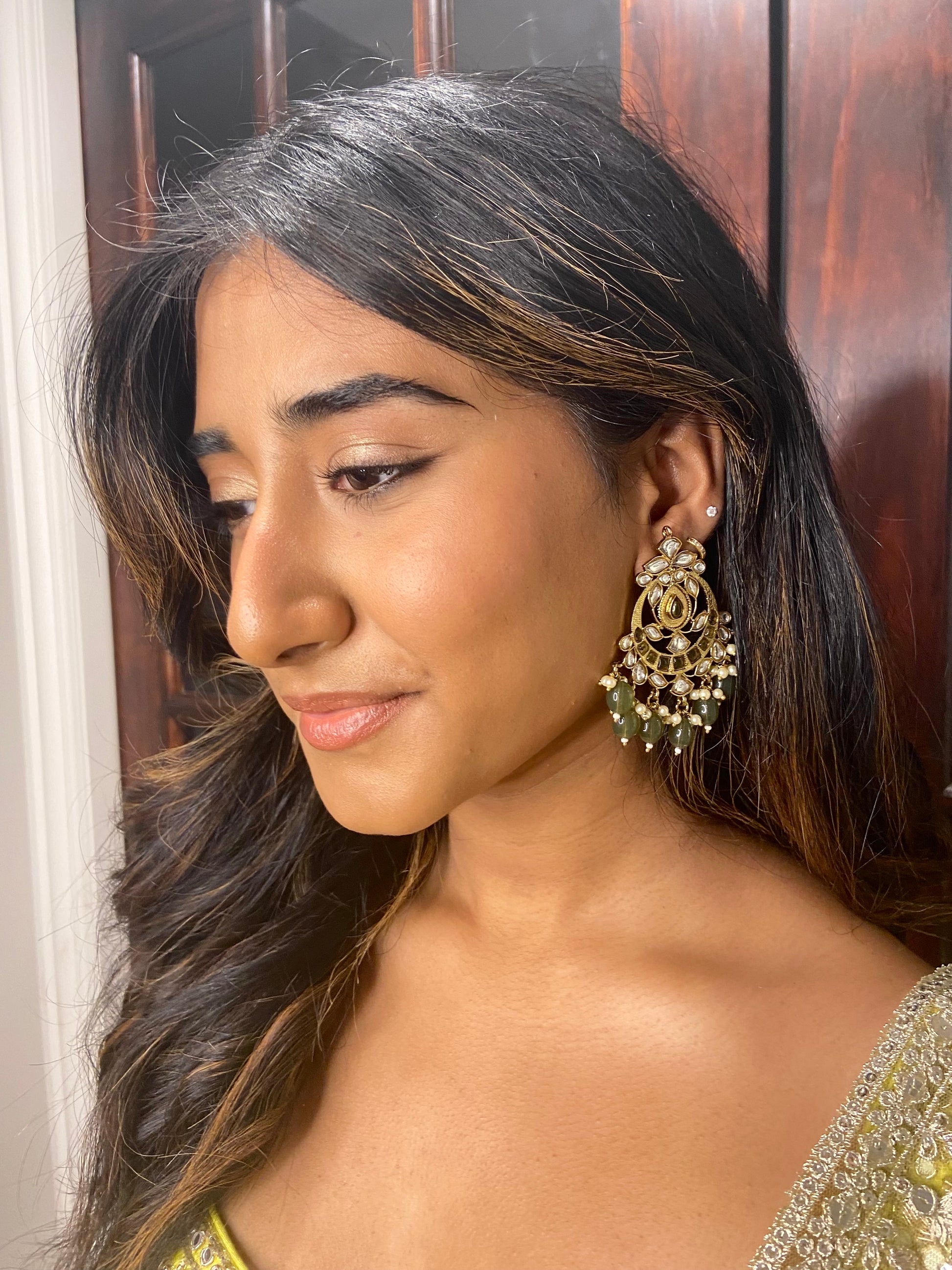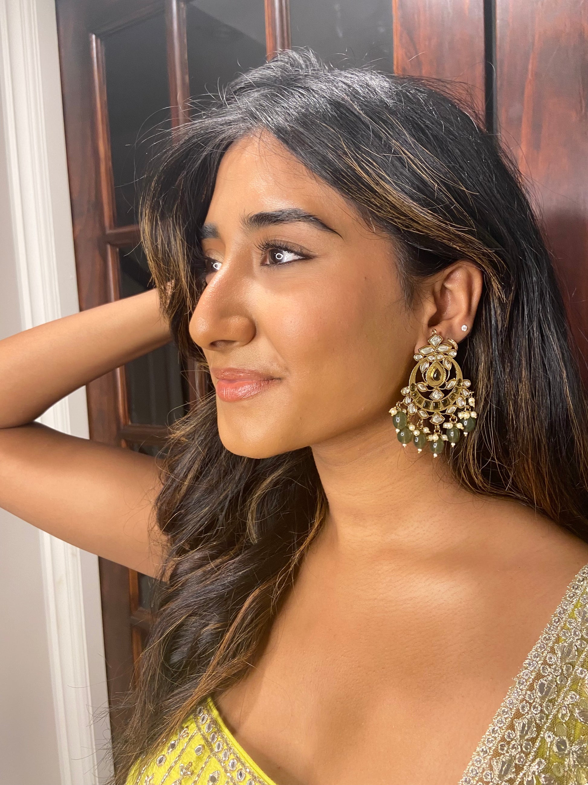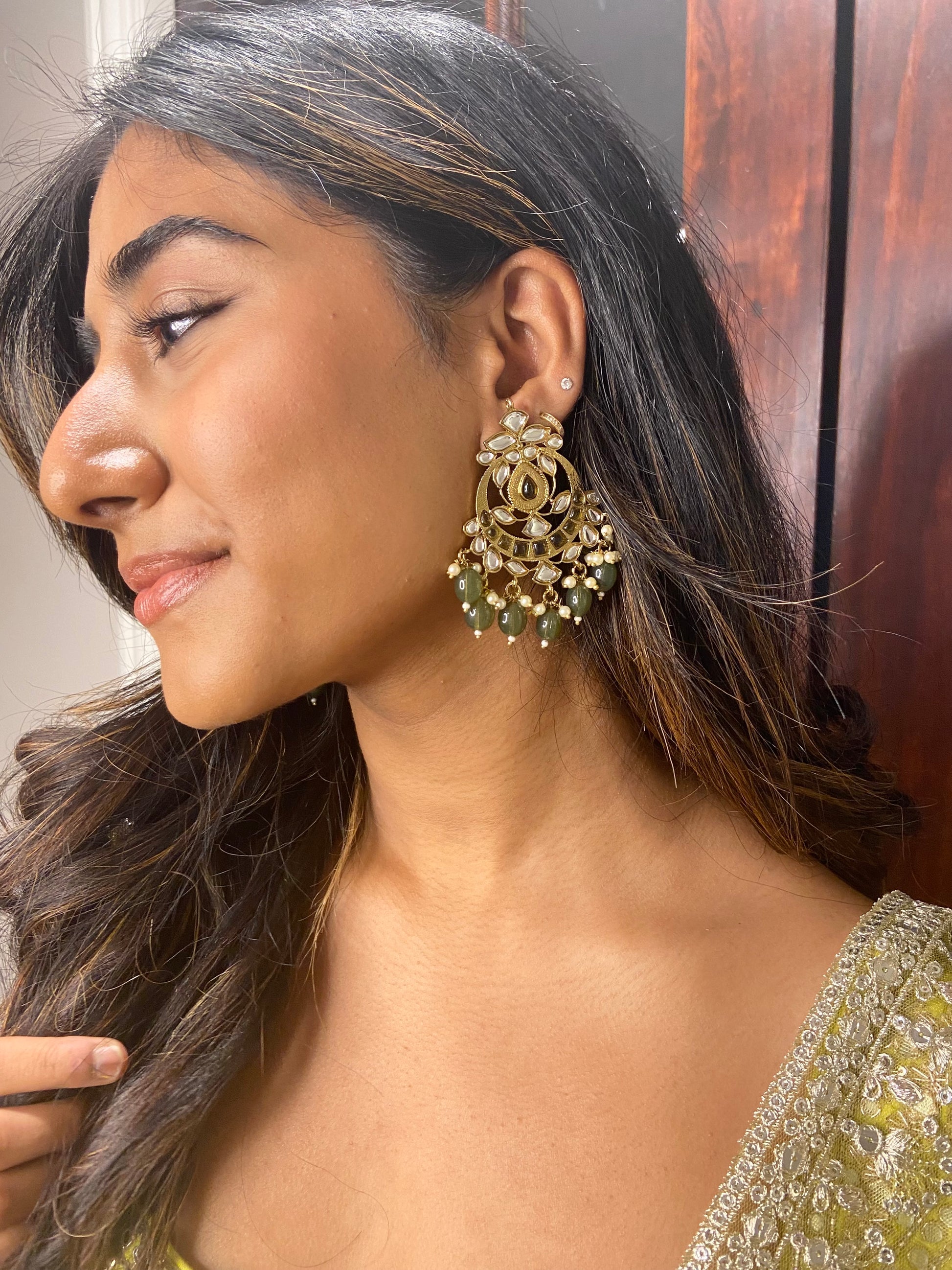 These stunning chandelier earrings feature an exquisite combination of traditional design elements. The earrings boast a beautiful gold-tone framework adorned with delicate clear stones arranged in a floral pattern. Dangling below are teardrop-shaped beads adding a soft pop of color. The intricate layering of pearls and shimmering stones enhances the earrings' opulence, making them perfect for festivities.