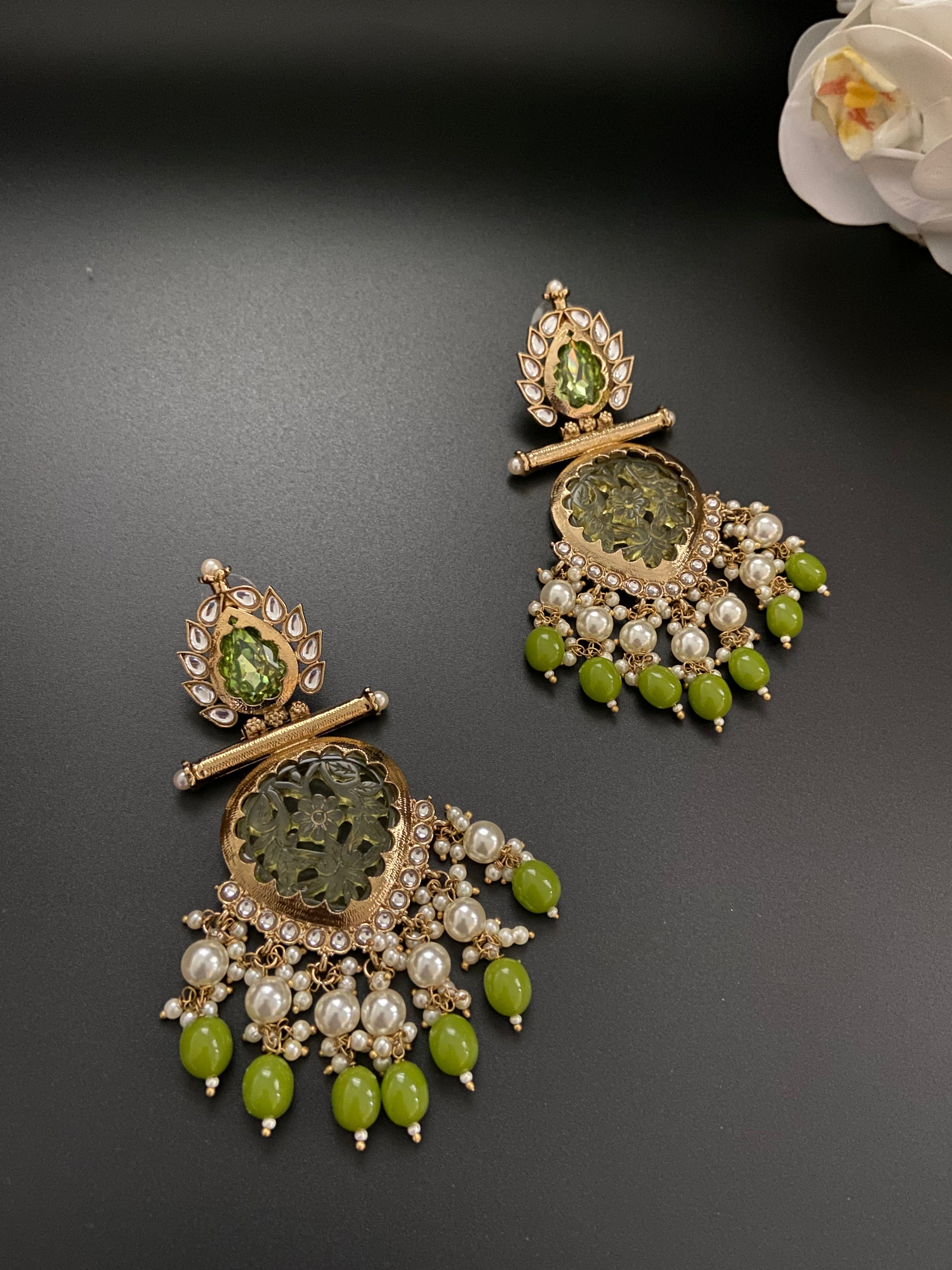 Dress up with these exceptionally beautiful engraved earring that are adorned with elegant Baby Pinky beads and Pearls. With an intricate floral pattern, they feature floral bud ear piece and pearl drops.