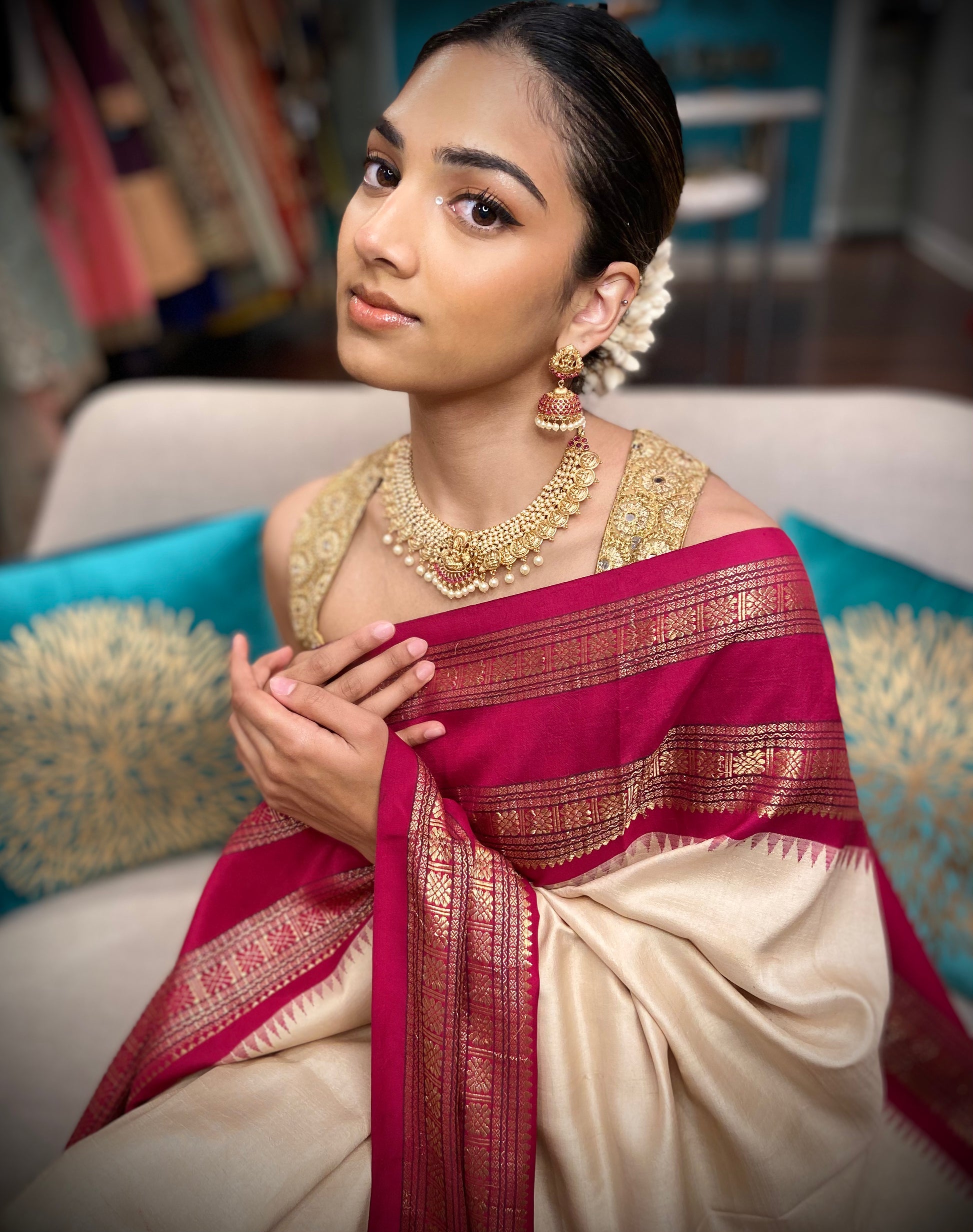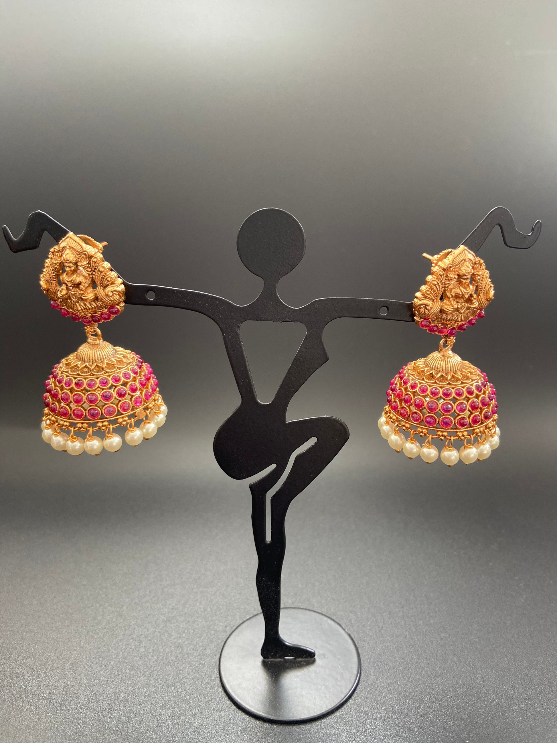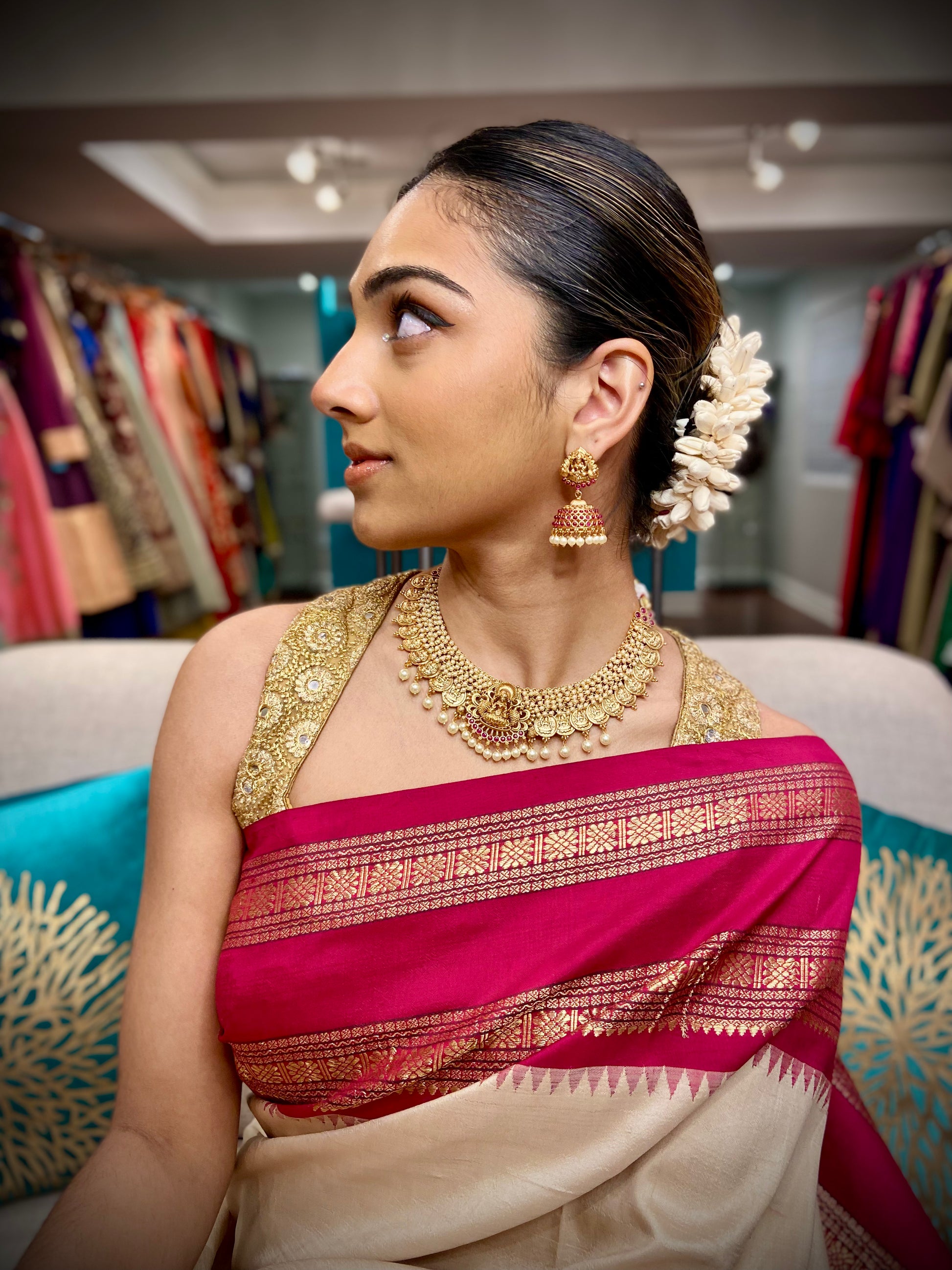 A fine synthesis of traditional aesthetics and majestic forms, this necklace set is nothing short of regality. Featuring a unique pattern of coins with Luxmi ji motifs on them, it is adorned with kemp stones, baby pearls and pearl drops. A striking pick for occasions ranging from wedding functions to festive parties.