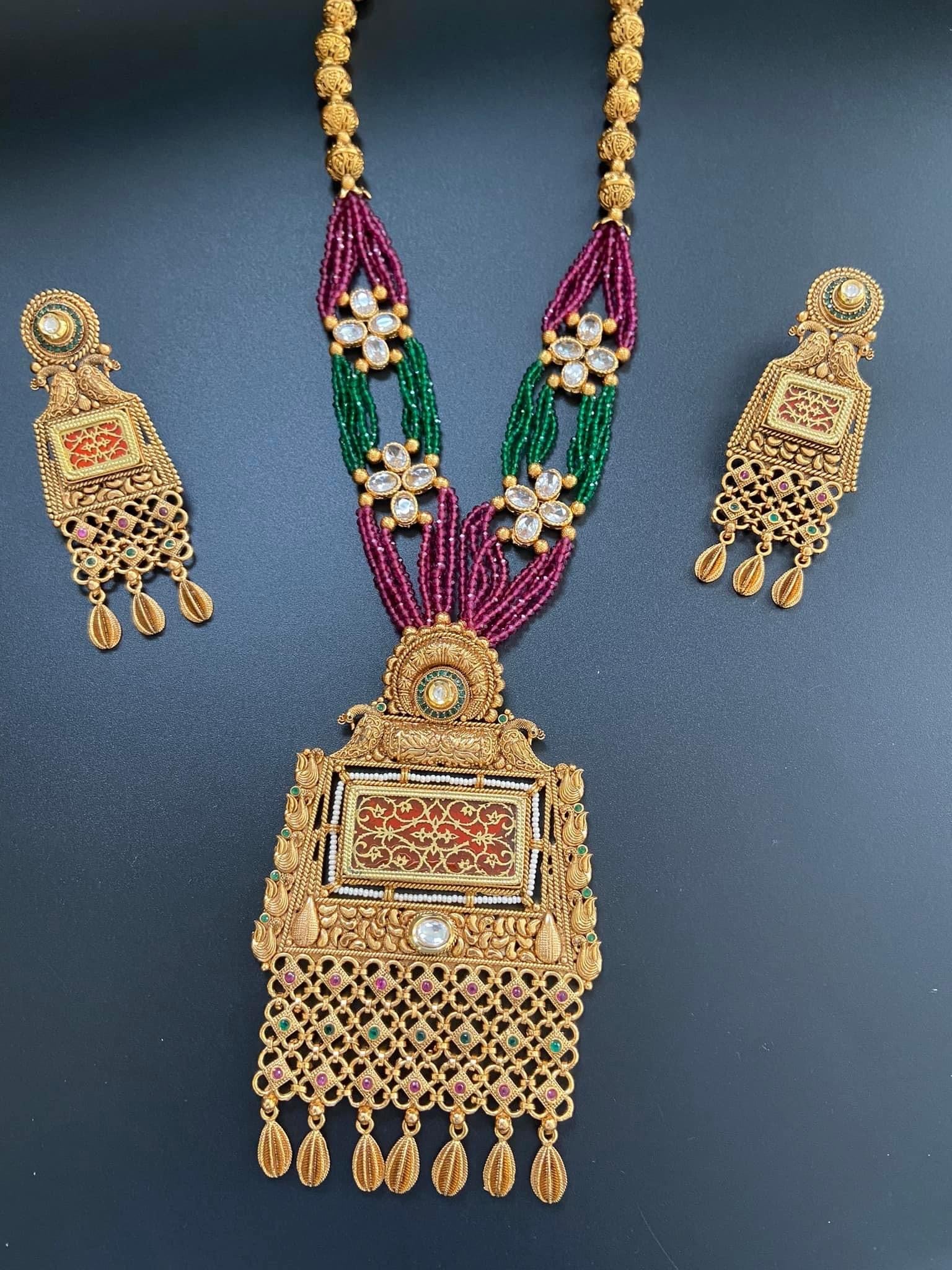 Crafted with utmost precision and attention to detail, this Necklace Set is a perfect blend of timeless elegance and cultural richness. This classic piece features Thewa, kundan and Filigree craftsmanship, with beautiful traditional elements.