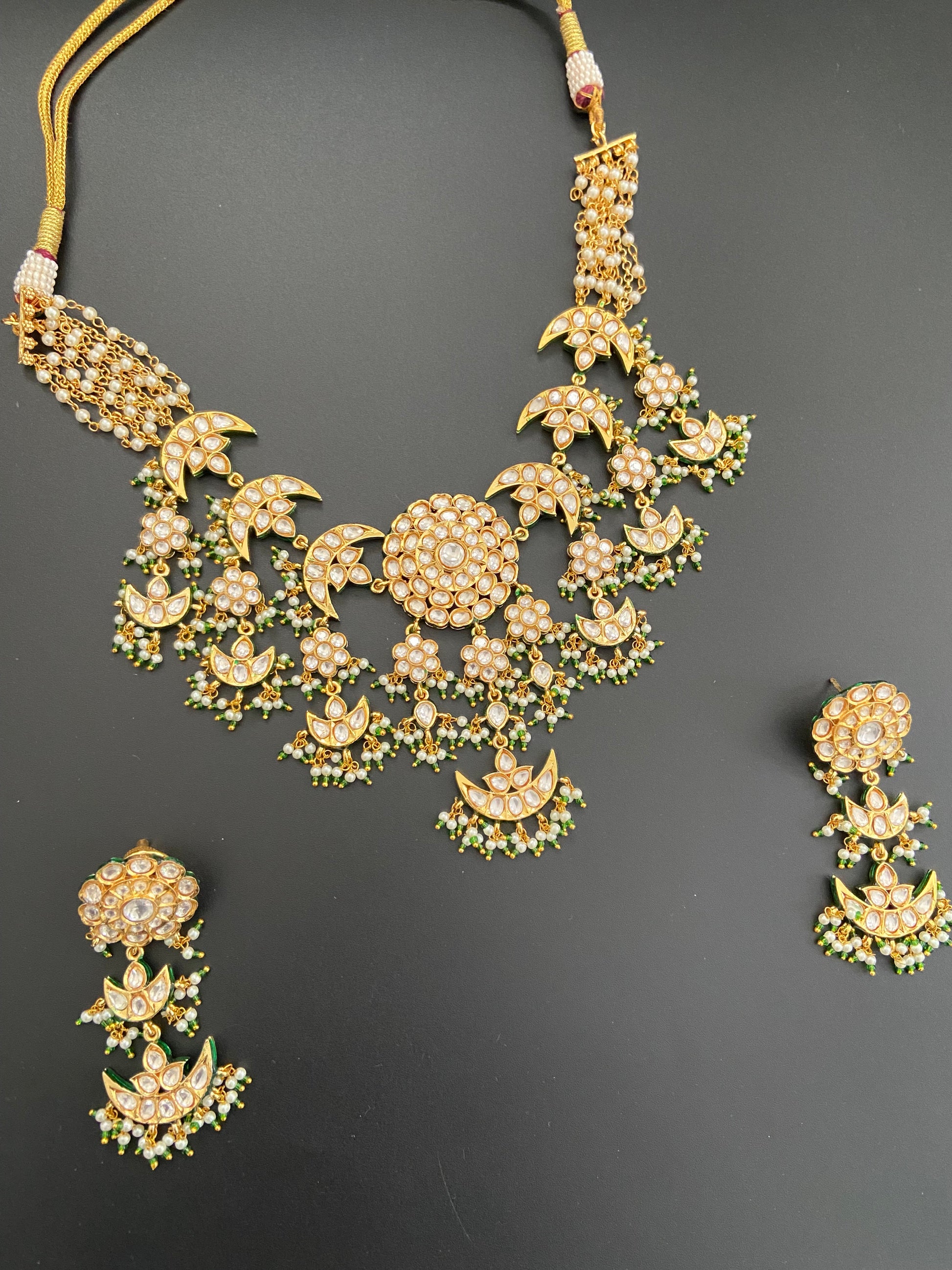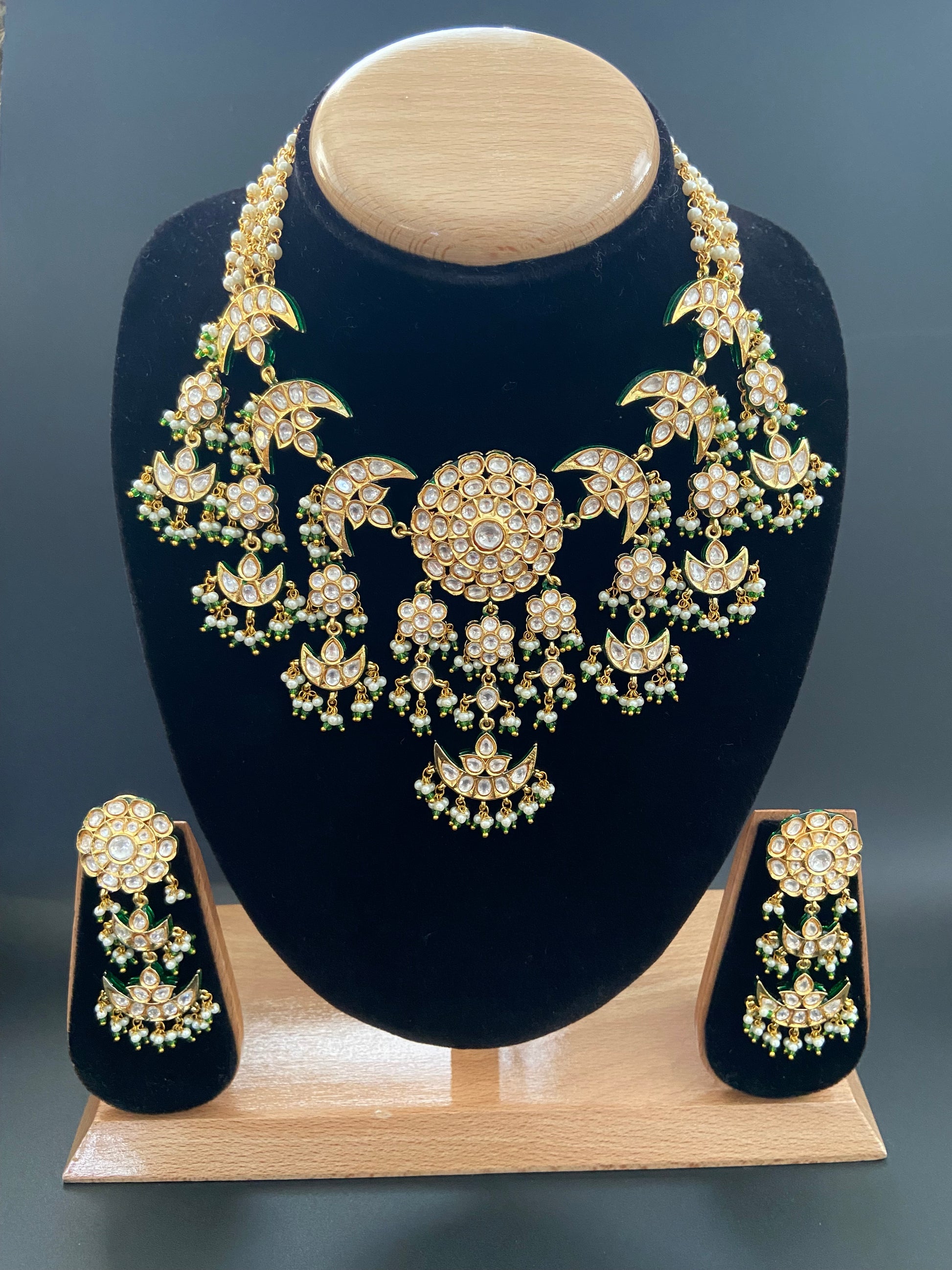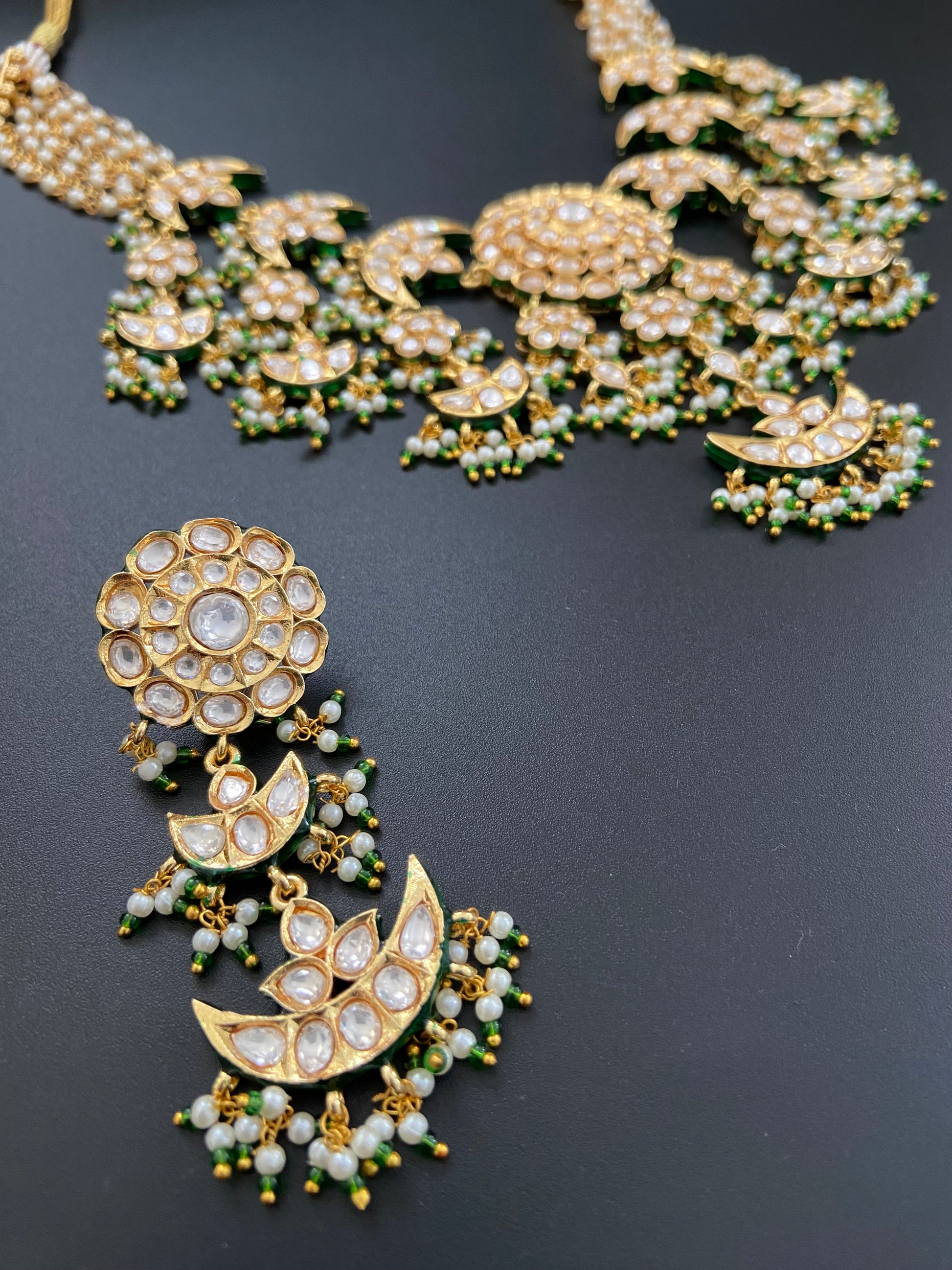 With a slight pop of green, this handcrafted set seamlessly intertwines tradition and modernity. The crescent moon motifs, beads, stones, and the refreshing floral element come together harmoniously, creating a uniquely captivating accessory that effortlessly complements your wedding looks.