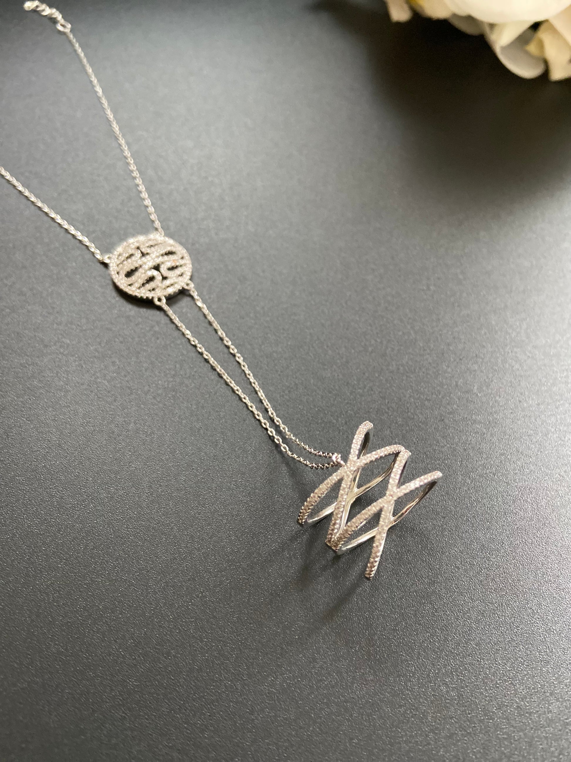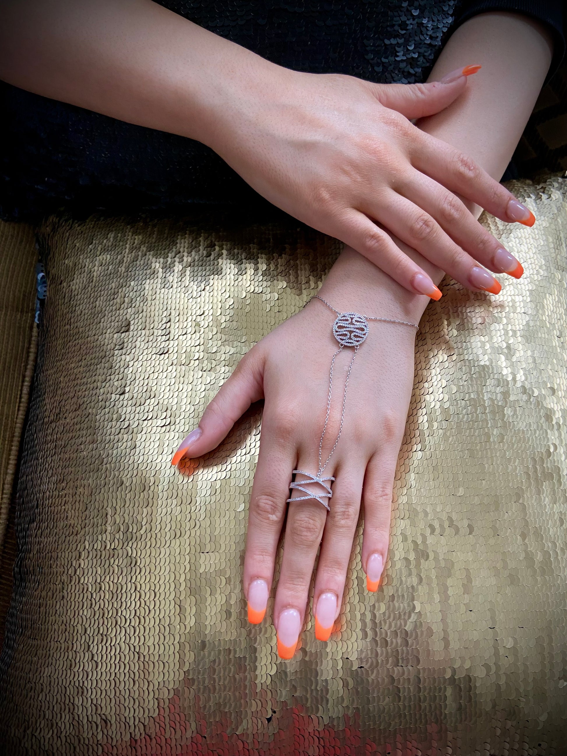 Adorned with glistening stones, its unique criss-cross design on the ring captures attention, making it a beautiful piece for any occasion. Its modern flair and versatility makes it a must have.