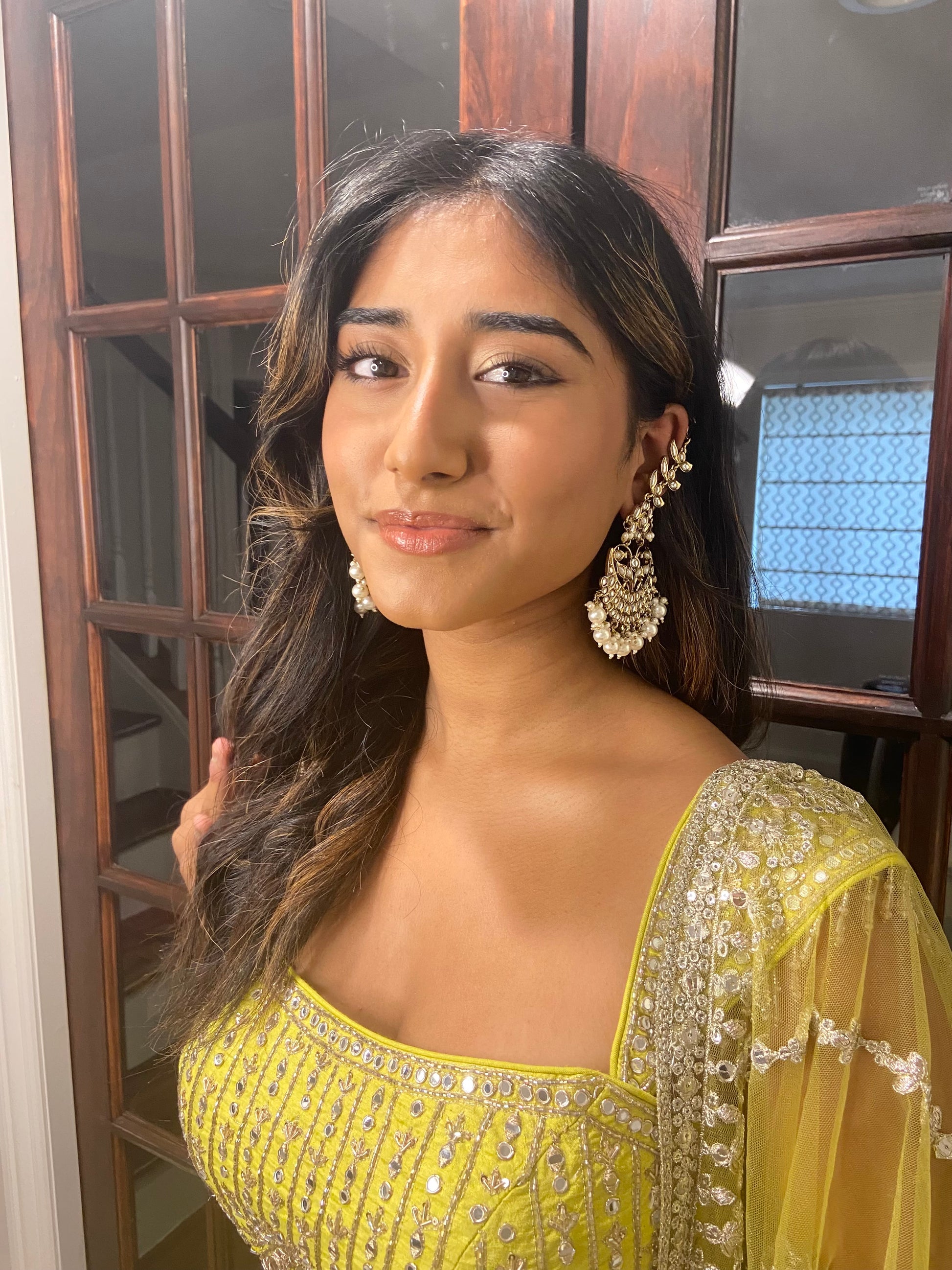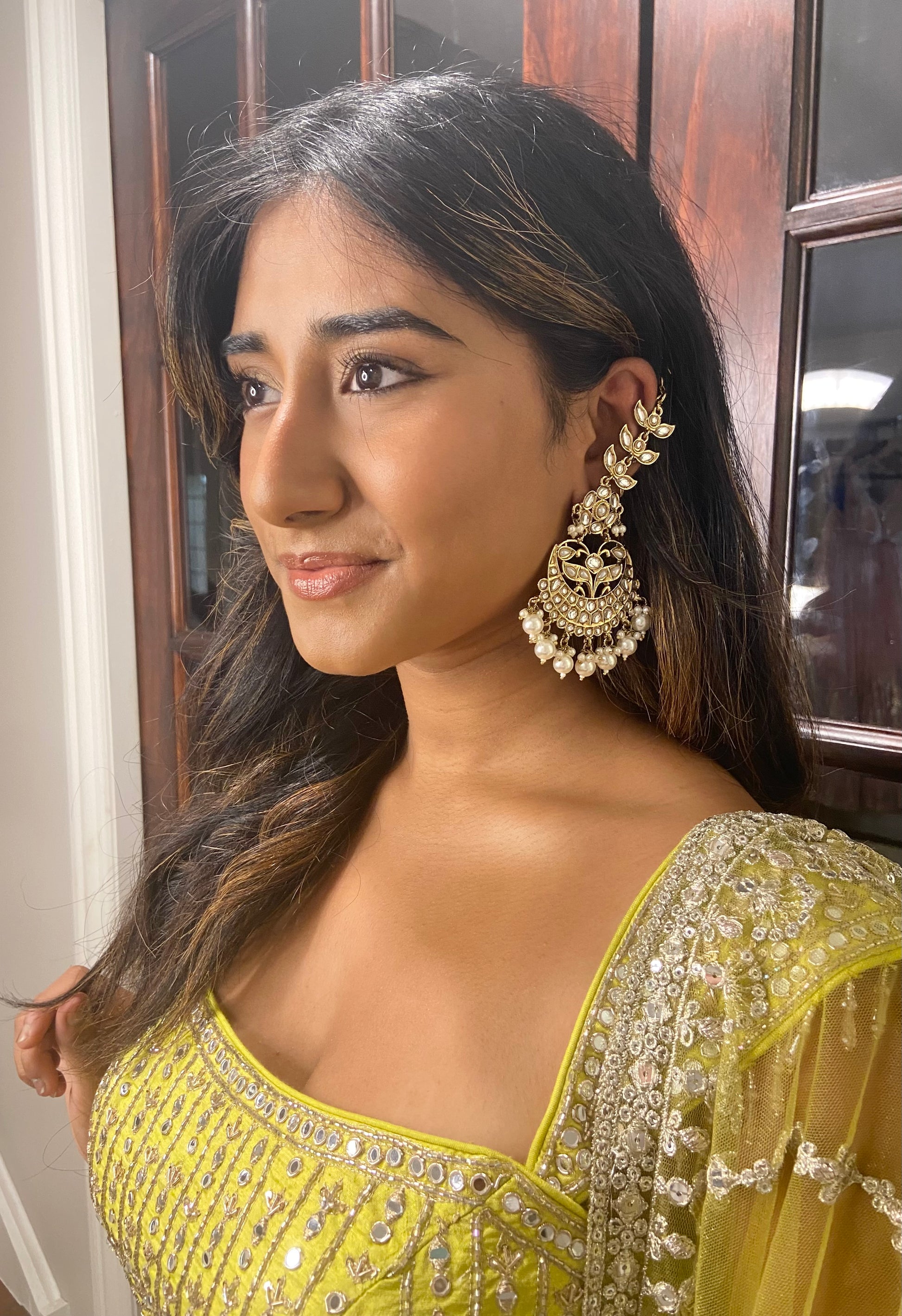 Add a splash of chic to your look with these gorgeous earrings that come in a subtle and neutral tone. Featuring a vintage cut out design, these earrings are adorned with pearls and stone. Light wear.